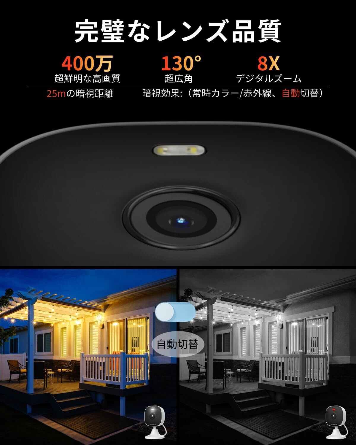 【素晴らしい視覚の饗宴】vsmahome 防犯カメラは屋外用で、最大400万画素の超解像度を提供します。HDRピクセル処理システム搭載 は太陽光を利用して画像をインテリジェントに調整し、受け取った画像をより鮮明に、監視カメラは鮮明な画質でシーンの細部まで再現します。見守りカメラは8倍デジタルズーを搭載しており、ズームしても鮮明で詳細な画像を維持します。ネットワークカメラは3.6mmレンズを搭載しており、視野角が20度広がり、視野距離が10メートル伸び、広い視野角で監視下の人、動物、車両、落ち葉まではっきりと見ることができます。ペットカメラとしても機能し、庭や玄関前の状況を鮮明に記録し、家族の安全を守ります。また、暗視カメラには2つの赤外線ライトと2つの白色ライトが搭載されており、照射距離は10メートル以上で、監視カメラにIR/フルカラー/自動インテリジェント夜間監視モードが搭載されています。屋内カメラに優れた夜間モードがあることを保証し、非常に暗い環境でも夜間に家の隅々まで監視できます。