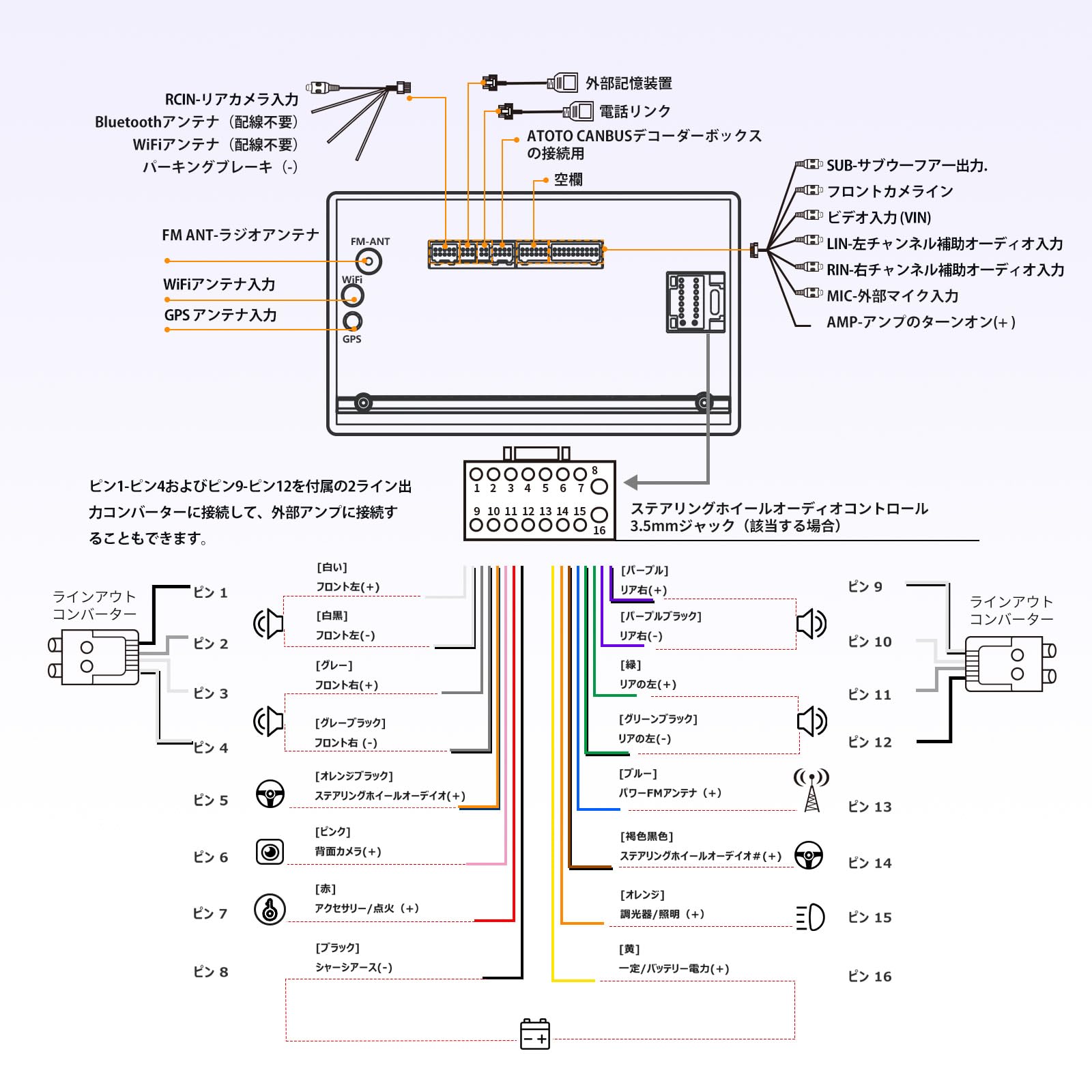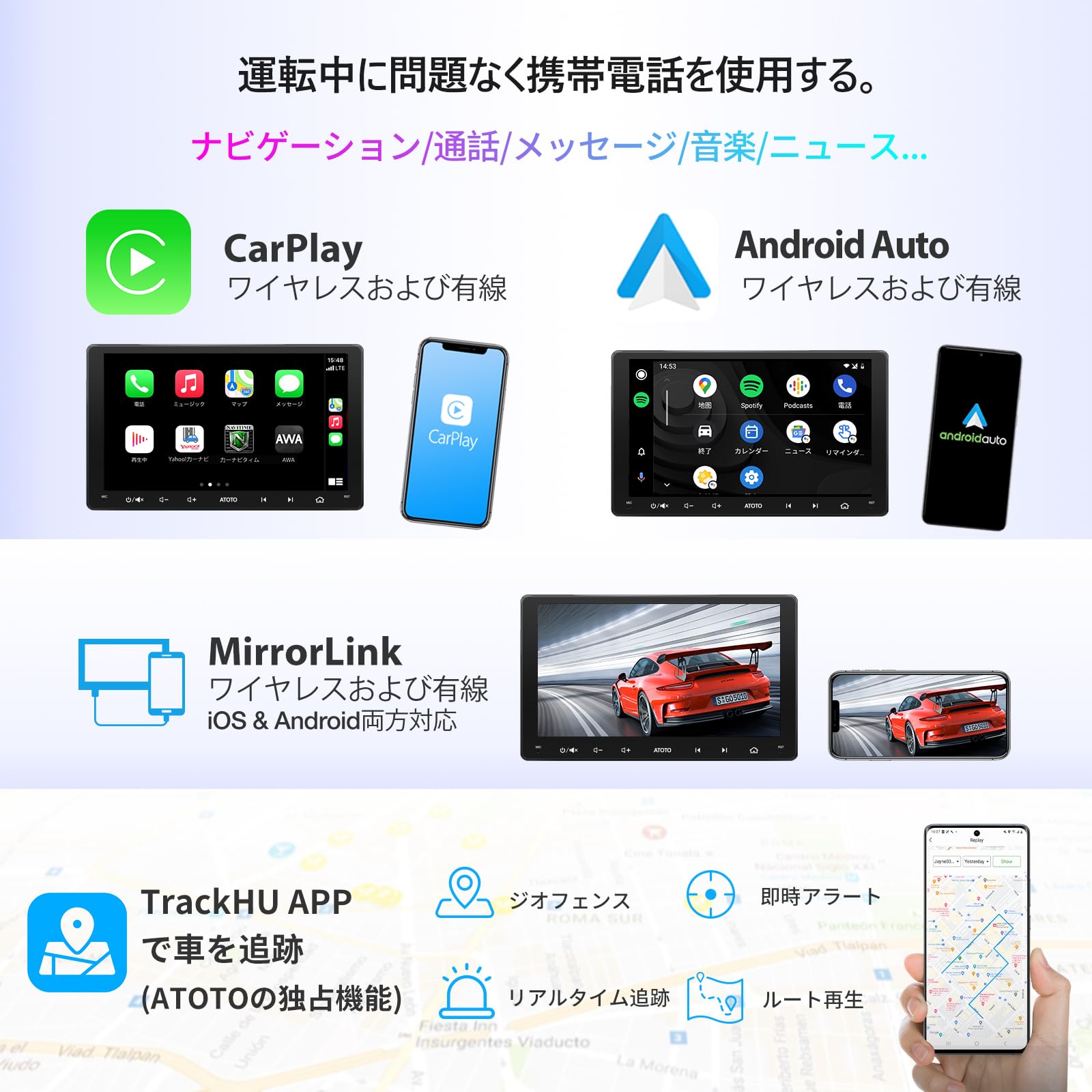 特徴 ワイヤレスCarPlayとAndroid Auto, MirrorLink, 36バンドEQ(DSP), GPS追跡(TrackHUアプリ), 3インターネットアクセス