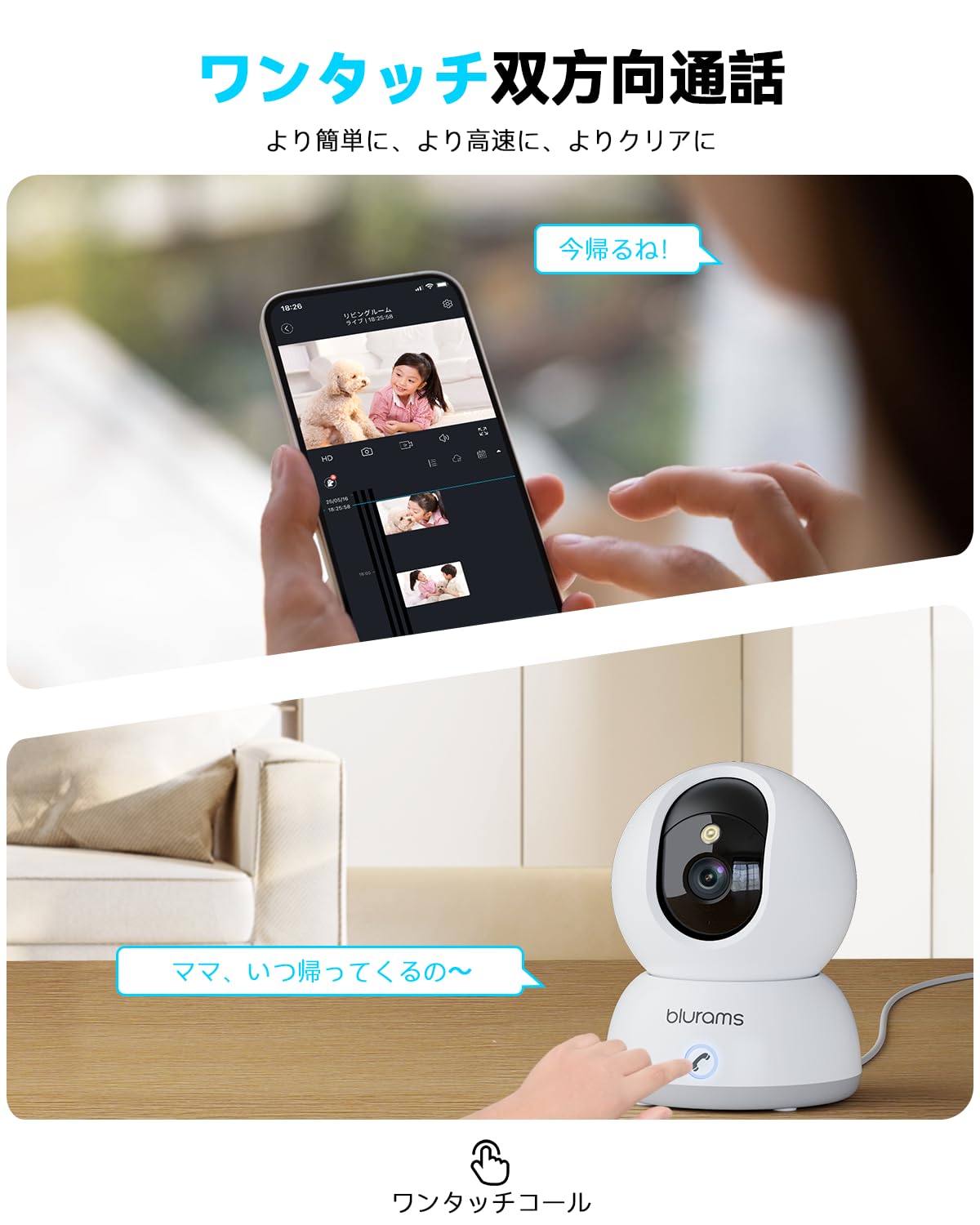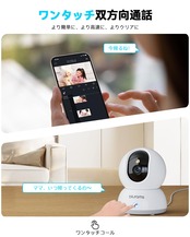 【ワンタッチコール・双方向通話】このベビーカメラはアプリを通じて、ワンタッチで家族に通話を発信できます。さらに、高性能マイクとスピーカーを内蔵し、3Dノイズ除去機能でクリアな音声を提供でき、外出先からでもクリアで生き生きとした双方向通話が可能です。