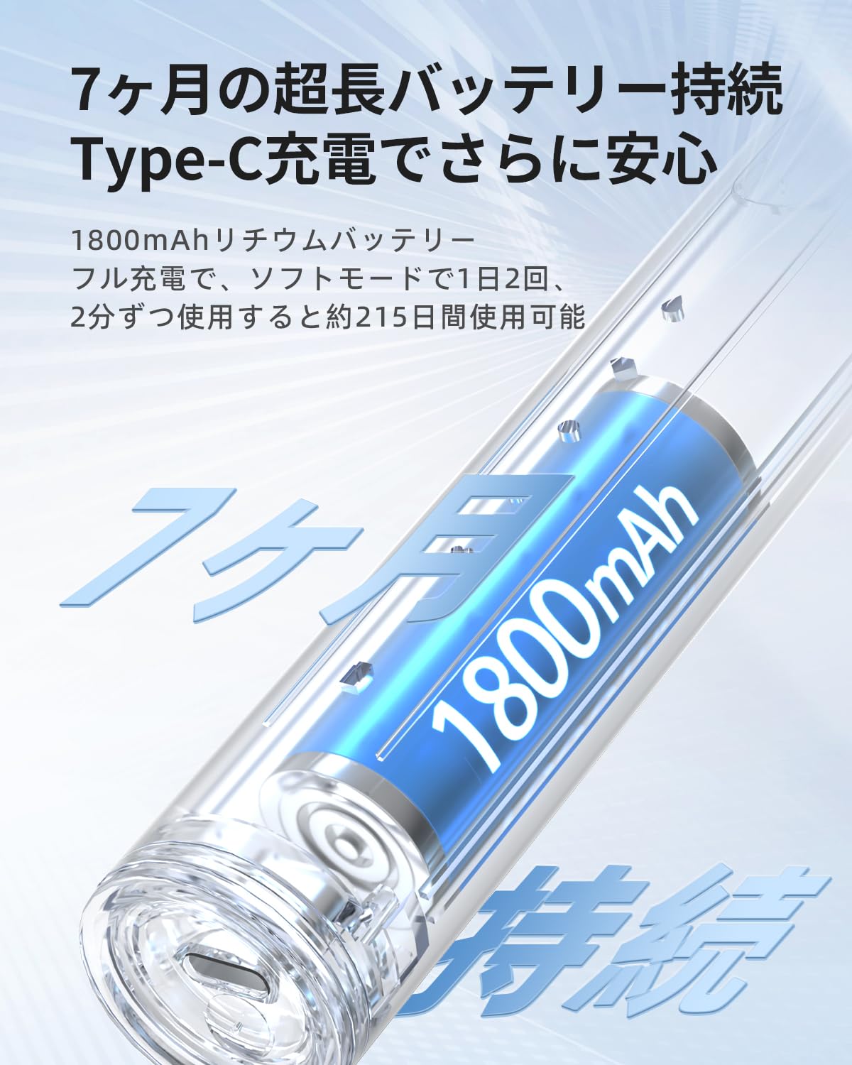 【長持ちバッテリーで手間いらず】 一度のフル充電で最大約7ヶ月(215日)使用可能。Type-C充電対応で、忙しい日常でも充電の手間を大幅に減らします。毎日の歯磨きがもっと快適に。自分用としても、親しい友人や家族へのプレゼントとしても喜ばれます。