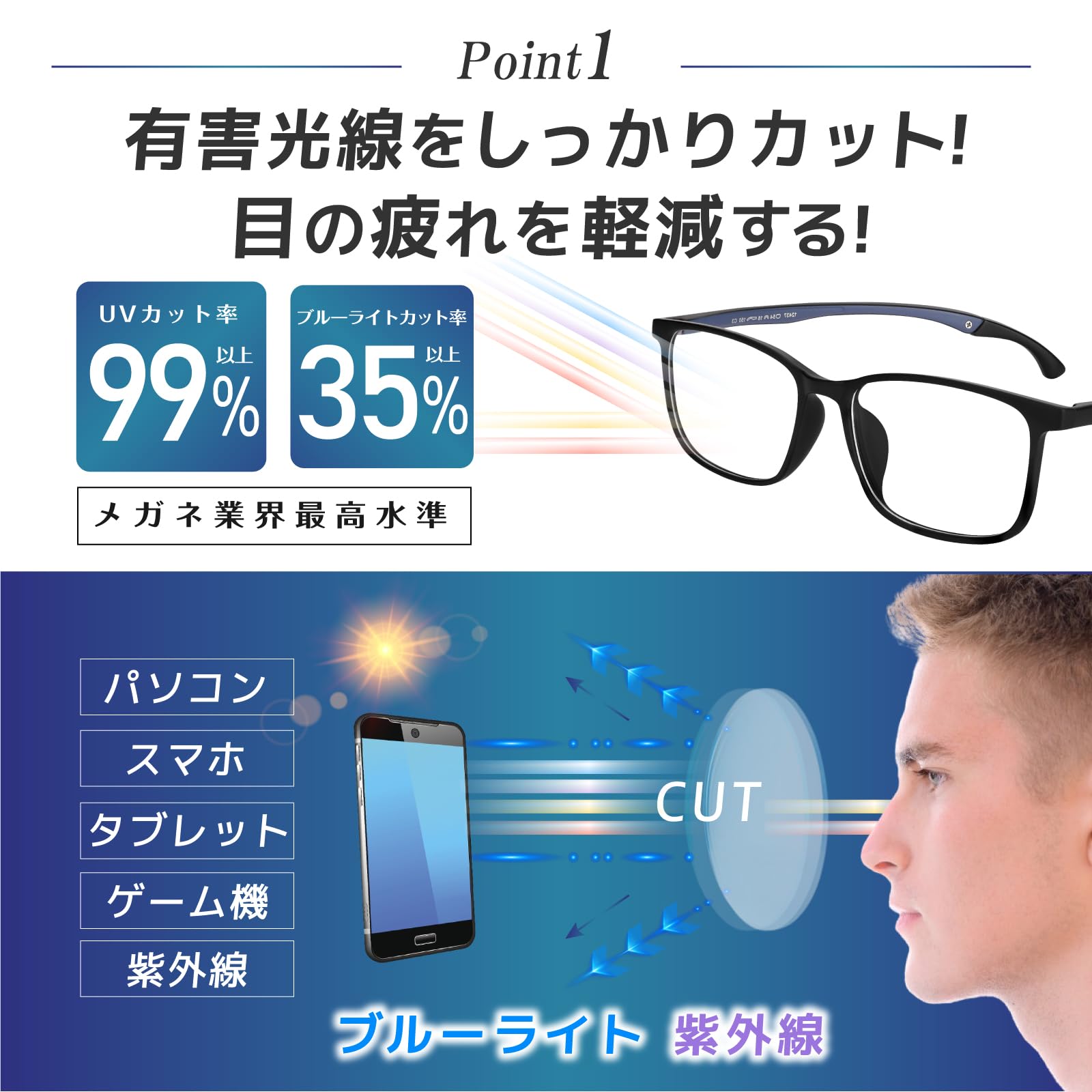【ブルーライトカット・UV紫外線カット】 本製品は、透明度が高く、高品質のブルーライトカットレンズを採用しています。 カット率(ブルーライトカット率40%以上、HEVカット率90%以上、紫外線カット率99%以上)は、 PCを長時間使用するビジネスパーソンや、スポーツやゲーマー、スマートフォンを長時間利用する方におすすめです。 眼精疲労の軽減や睡眠の質の向上、頭痛の軽減、視力の保護、そして目の乾燥の軽減に効果的であり、耐衝撃性が高く、傷が付きにくい設計は、長時間の使用でも安心してお使いいただけます。