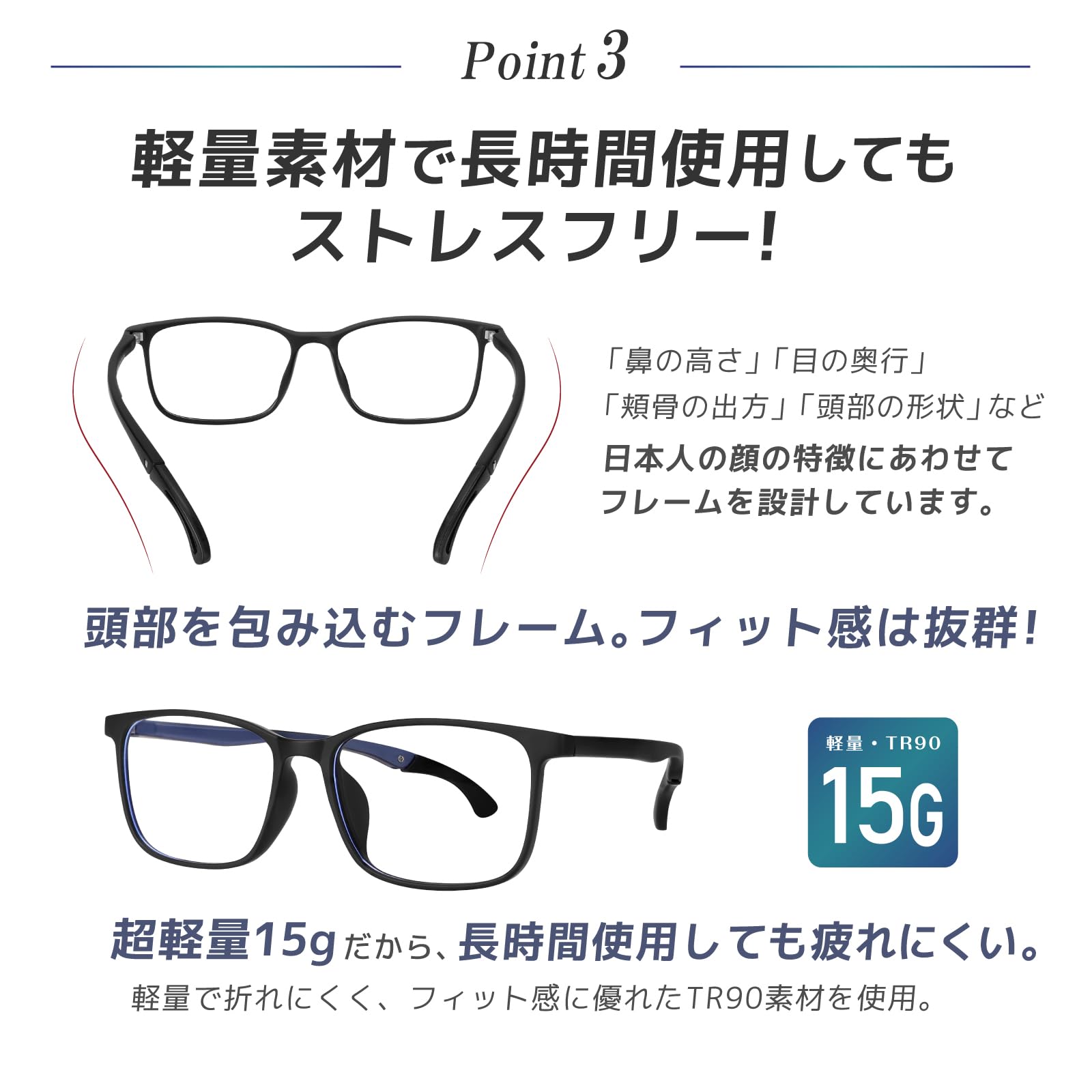 【フィット感NO1.ずれ落ち防止設計】 重さわずか15gで、TR90素材のフレームを使用し、軽量かつ耐久性のある製品を実現しました。 本製品は、フレーム幅やツルの長さ、カーブにも配慮し日本人の顔に最適化されたジャストフィット設計です。 また、ずれ落ちを防止し、ツル調整も4段階可能なので、どんな顔にもピッタリフィットします。 その薄型軽量設計は、長時間の着用でも快適に使用して頂けます。