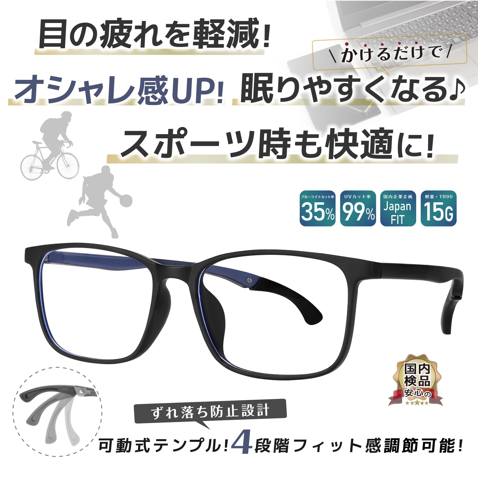 [愛鏡] ブルーライトカットメガネ ズレ落ち防止 ツル調整可能 紫外線カット 【国内企業企画】【30日品質保証】PC眼鏡 パソコン用 スポーツメガネ JIS規格40% UVカット99% スクエア型 度なし