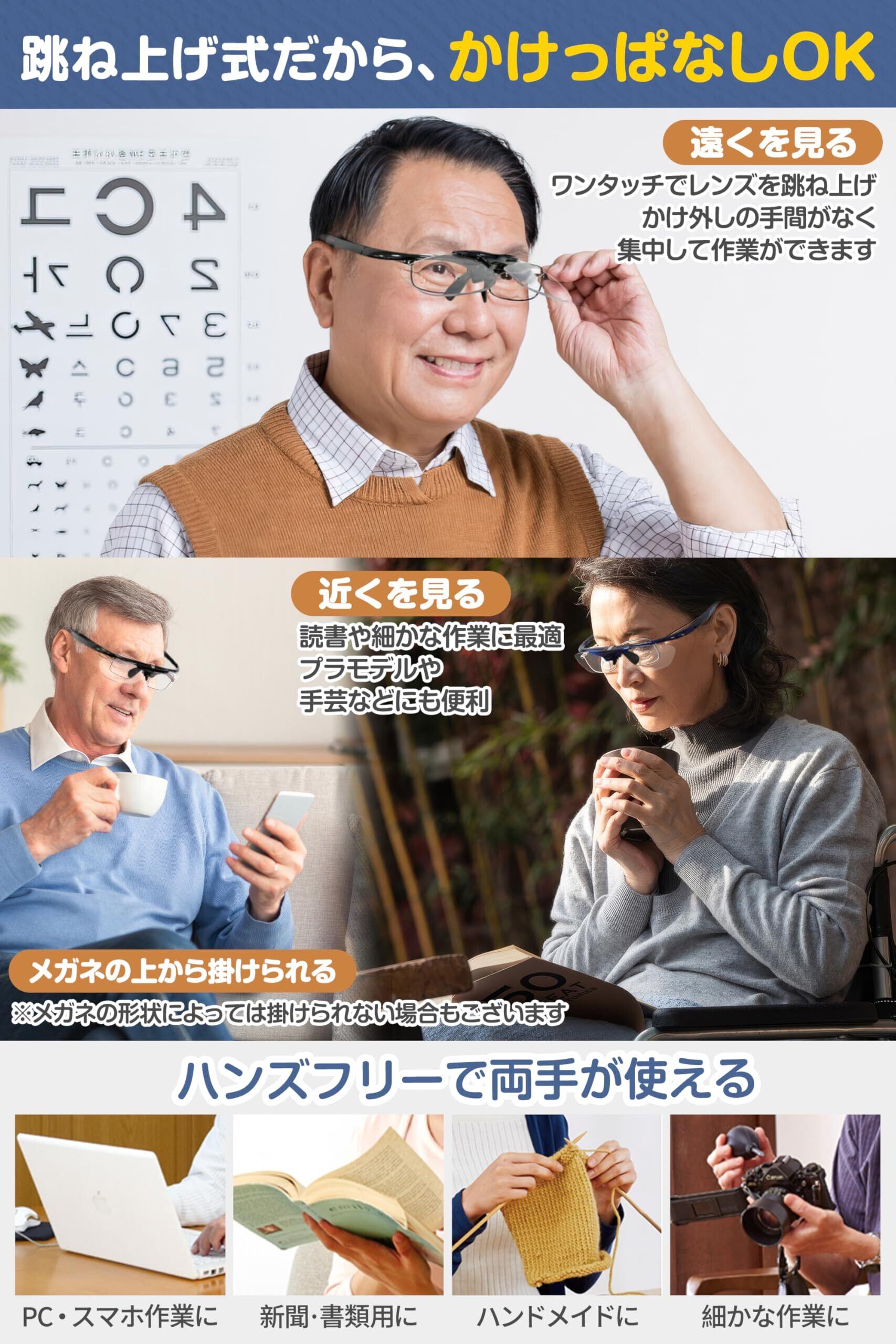 【最新型メガネ型ルーペ・倍率約1.6倍】倍率約1.6倍は、対象物から約20~25cmほど離れて見える最大倍率です。メガネ型ルーペは近用の文字等を見やすく(拡大)する事を目的に作られています。目とレンズの距離、レンズと対象物の距離により見え方が変わりますので、焦点距離を調整し、見やすい距離でご使用ください。※視力や焦点距離には個人差があります。見えにくい場合は、レンズの倍率や焦点距離が合っていない可能性があります。近距離用であり、遠くを見る目的では使用できません。倍率合わないや初期不良はもちろん、通常使用での破損も対象となります。