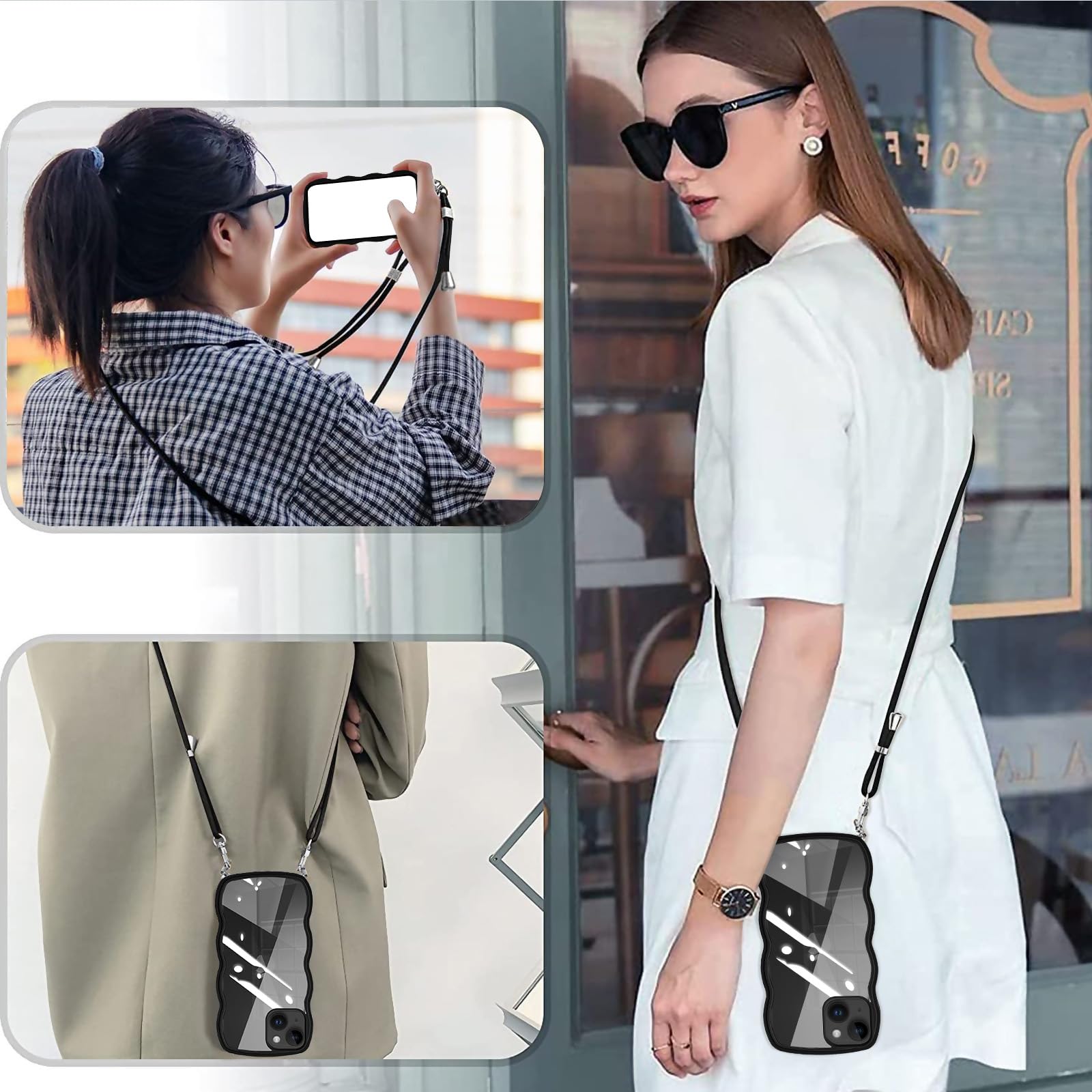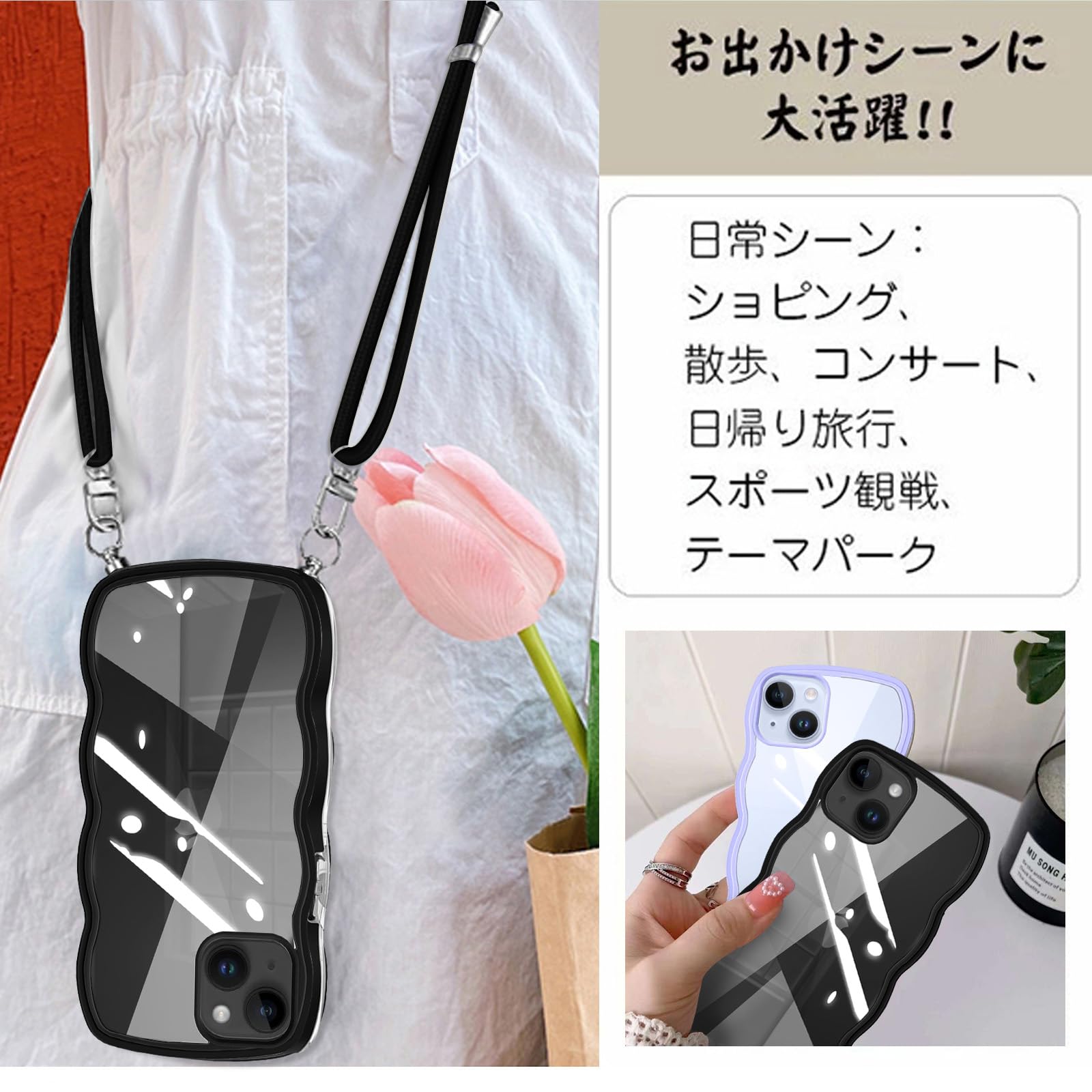iPhone 15 ケース クリア ショルダー カバー 首掛け 肩がけ 斜めかけ 紐付き ストラップ付き iphone15 ケース 韓国 可愛い かわいい 透明 薄型 軽量 耐衝撃 シリコン TPU バンパー アイフォン 15 スマホケース ブラック