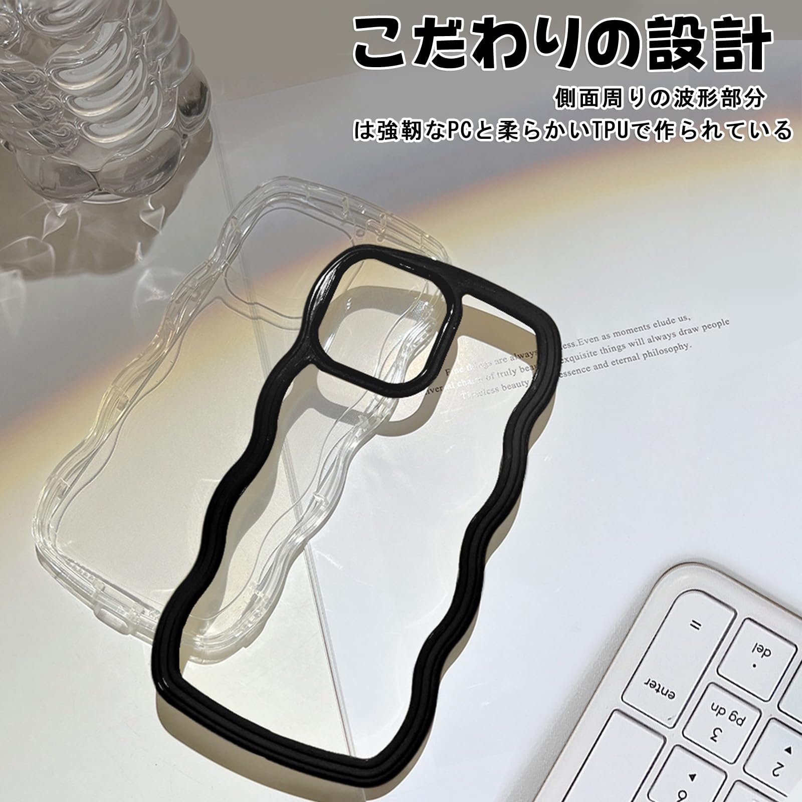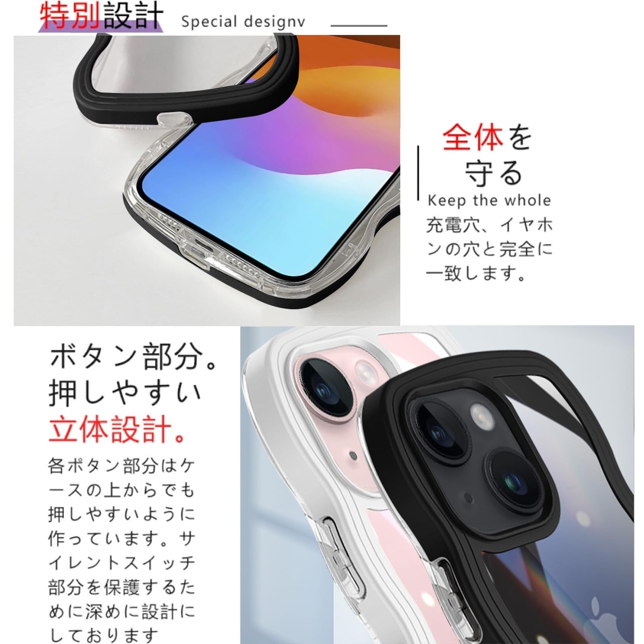 【全面保護】カメラレンズの周りに段差をつけて擦り傷を防ぎます、平らな場所においても、液晶画面とカメラレンズに直接触れることがなく、ケース内側四隅のエアクッションデザインにより、ケースの四角を強化し、本体が落ちる場合に伝わる衝撃を吸収し、落下時の衝撃を最小限に抑えます、iPhone15を全方位からしっかり守れます