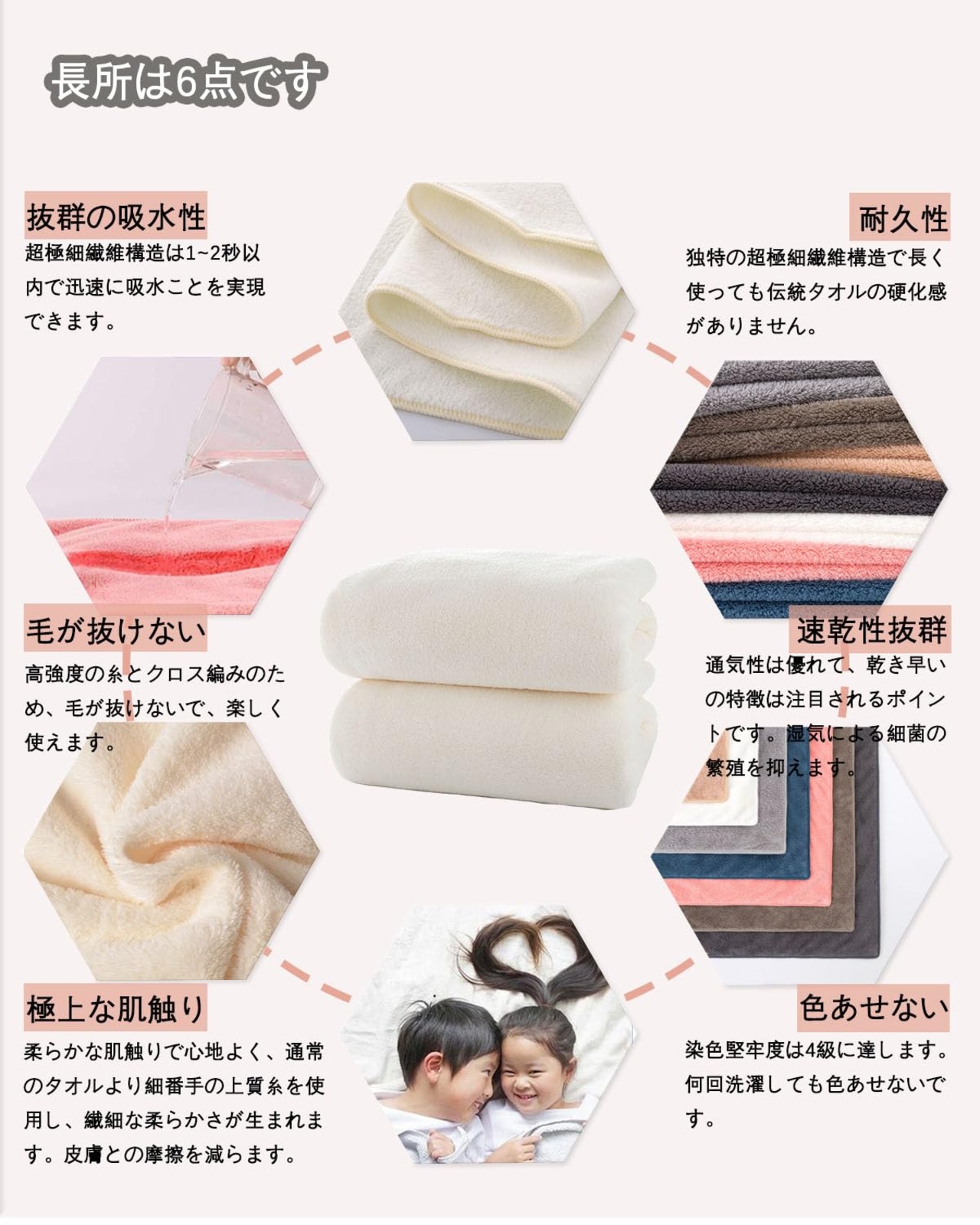 【材質】:ポリエステル85%、ポリアミド15%高級マイクロファイバー素材を採用 - このタオルは毛髪の1/100超微細繊維(マイクロファイバー)で作られたバスタオルです、触り心地最高、優しくてやわ らかい肌触りです、やさし い仕上げに蛍光染料は使用 しておりません。品質:このバスタオルが色褪せない、毛羽落ちしないことを保証します。