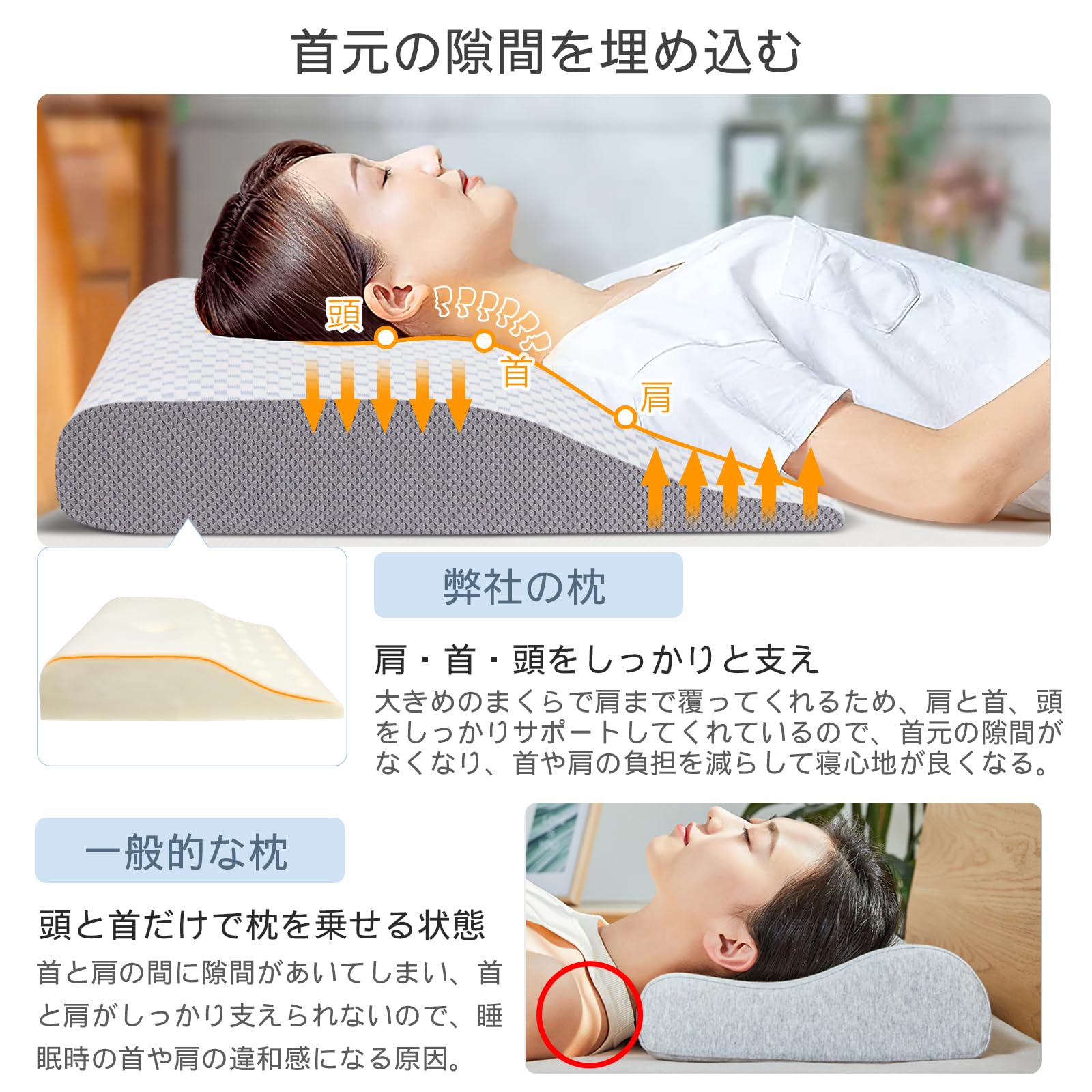 【肩・首・頭をしっかりと支え】大きめのまくらで肩まで覆ってくれるため、肩と首、頭をしっかりサポートしてくれているので、首元の隙間がなくなり、上半身全体で体圧を分散するので、首や肩の負担が減り寝心地が良くなり。首部を自然な状態にキープし、寝ている時の気道を開くことで、呼吸がスムーズになります。肩・首・頭にピッタリフィット、肩・首の疲れ・眠れない・スマホ首などの場合を和らげます。※ ご注意:身長172CM以下の方に適しています。