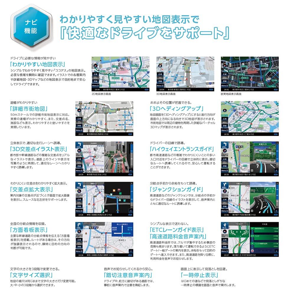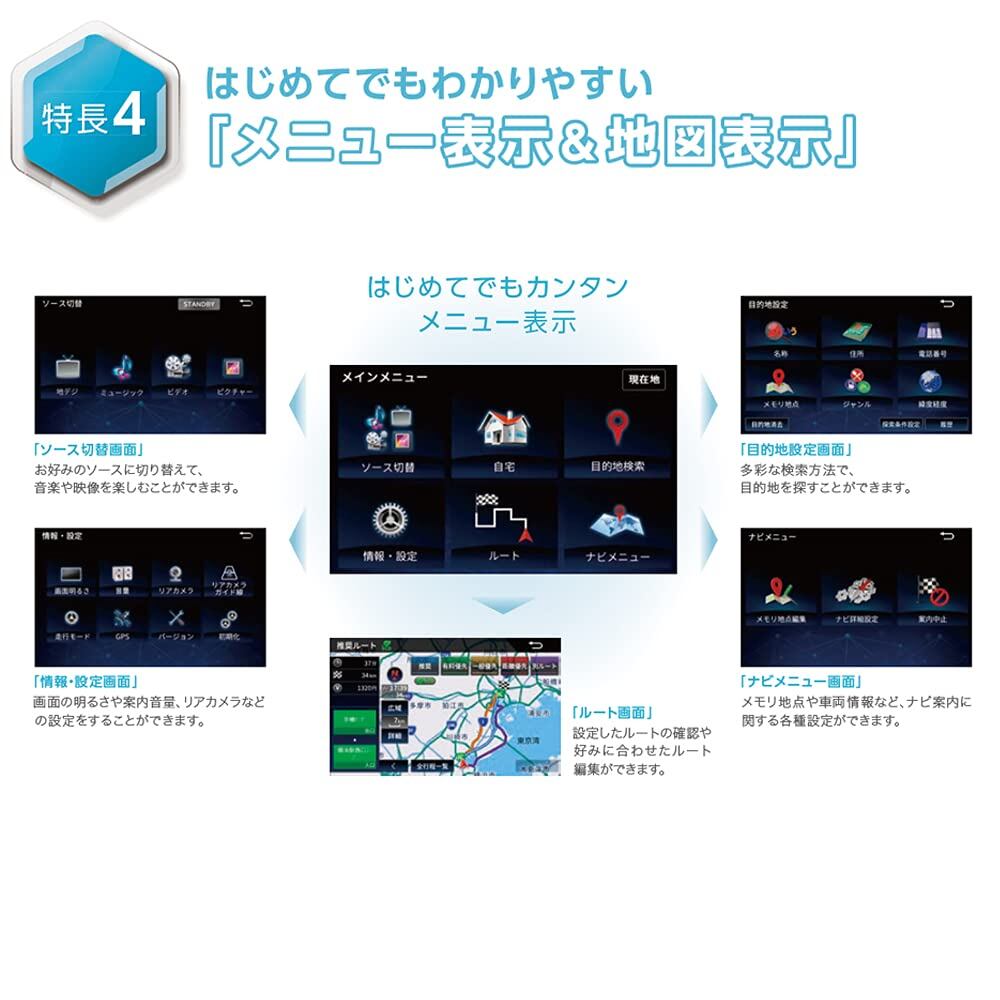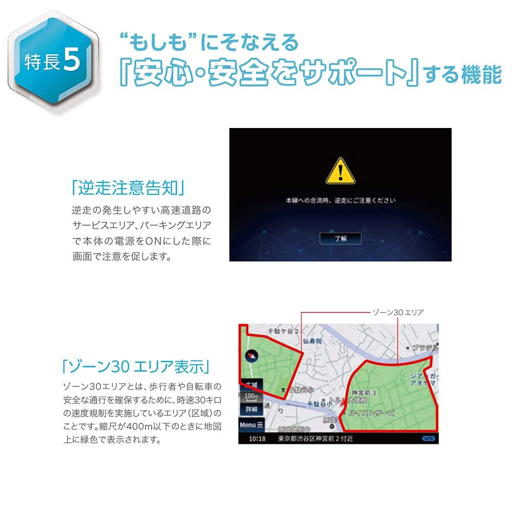 見やすさと分かりやすさを徹底追及。地図データーは彩速ナビで実績のあるインクリメントP社の地図を採用。3D交差点イラストや市街図で見やすい。メニュー画面もアイコンが大きくわかりやすい。また、逆送の発生しやすい高速道路のサービスエリア・パーキングエリアで本体の電源をONにした際に画面で注意を促します。地図更新はできません。