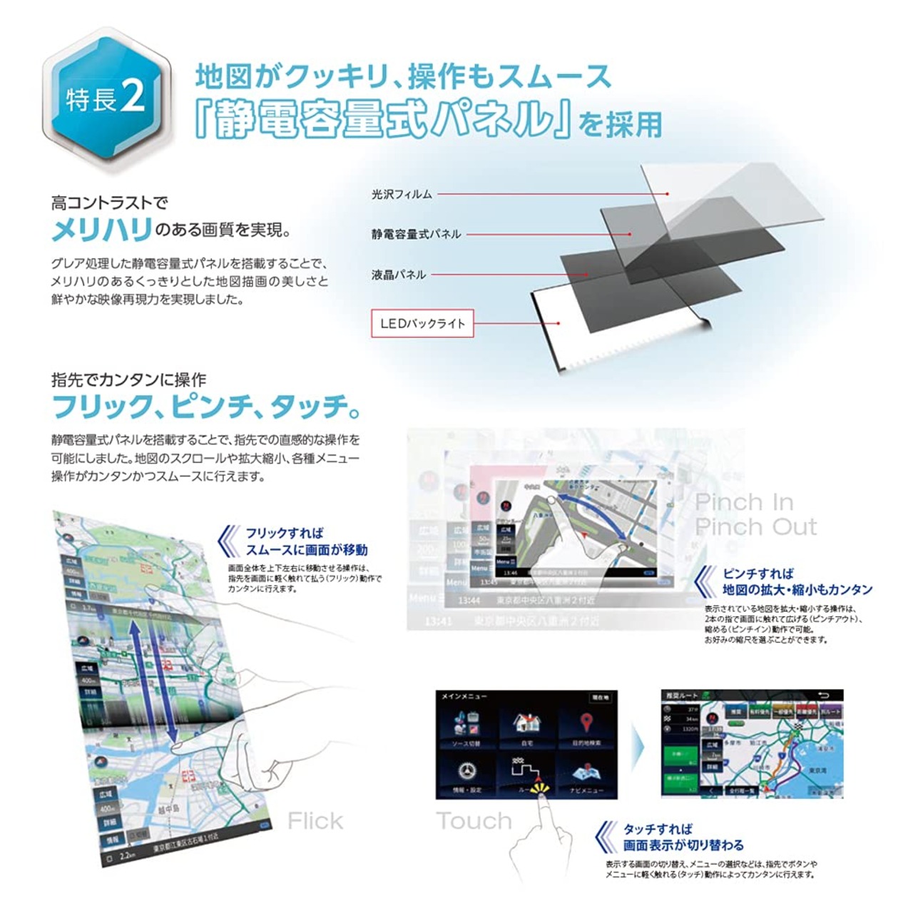地図がはっきりクッキリ見やすく、スマホのようなフリックやピンチイン/アウトで指先でカンタンにスムーズに操作できる静電容量式パネルを採用。