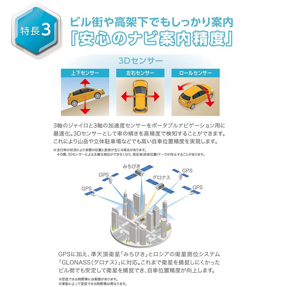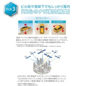 自社位置精度を高める3Dセンサー&3種の衛星受信を搭載。【3Dセンサー】ジャイロ3軸&加速度3軸の高精度3Dセンサー搭載で高架下などの測位しずらい場所での精度が向上し、高い自車位置精度で走行できます。 【3種の衛星受信】GPSに加え、みちびきとグロナスにも対応。