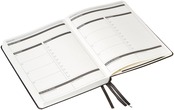 ブラックのハードカバー、ゴムバンド留め、リボンのブックマークが付いています。