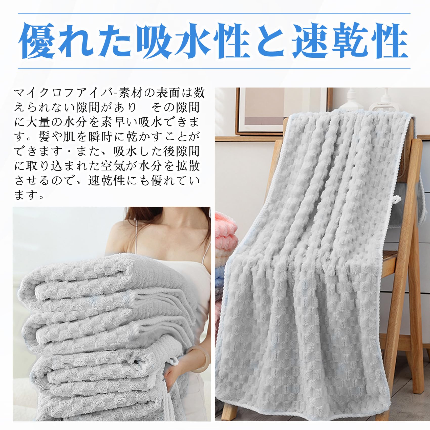 【優れた吸水性、速乾性】綿素材より優れた吸水性と速乾性。 マイクロファイバー素材の表面には無数の隙間があり、その隙間に大量の水を素早く吸収します。 髪や肌を軽く拭くだけで水分を吸収し、ホコリがつきにくいです。 バスタオルの隙間により、隙間に溜まった水分を空気が素早く拡散させるので、乾燥が早く。抗菌・防臭効果もあります、湿気によるカビや細菌の繁殖を抑えます。