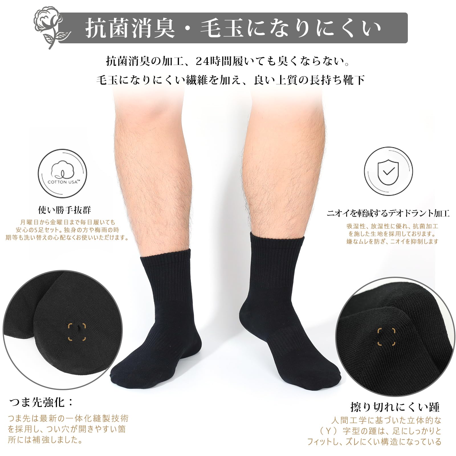 [K・NIVE] 靴下 メンズ ビジネスソックス 黒 破れにくい 抗菌消臭 蒸れない 毛玉になりにくい コーマ綿 無地 くつした 5足組セット 24.0~28.0cm