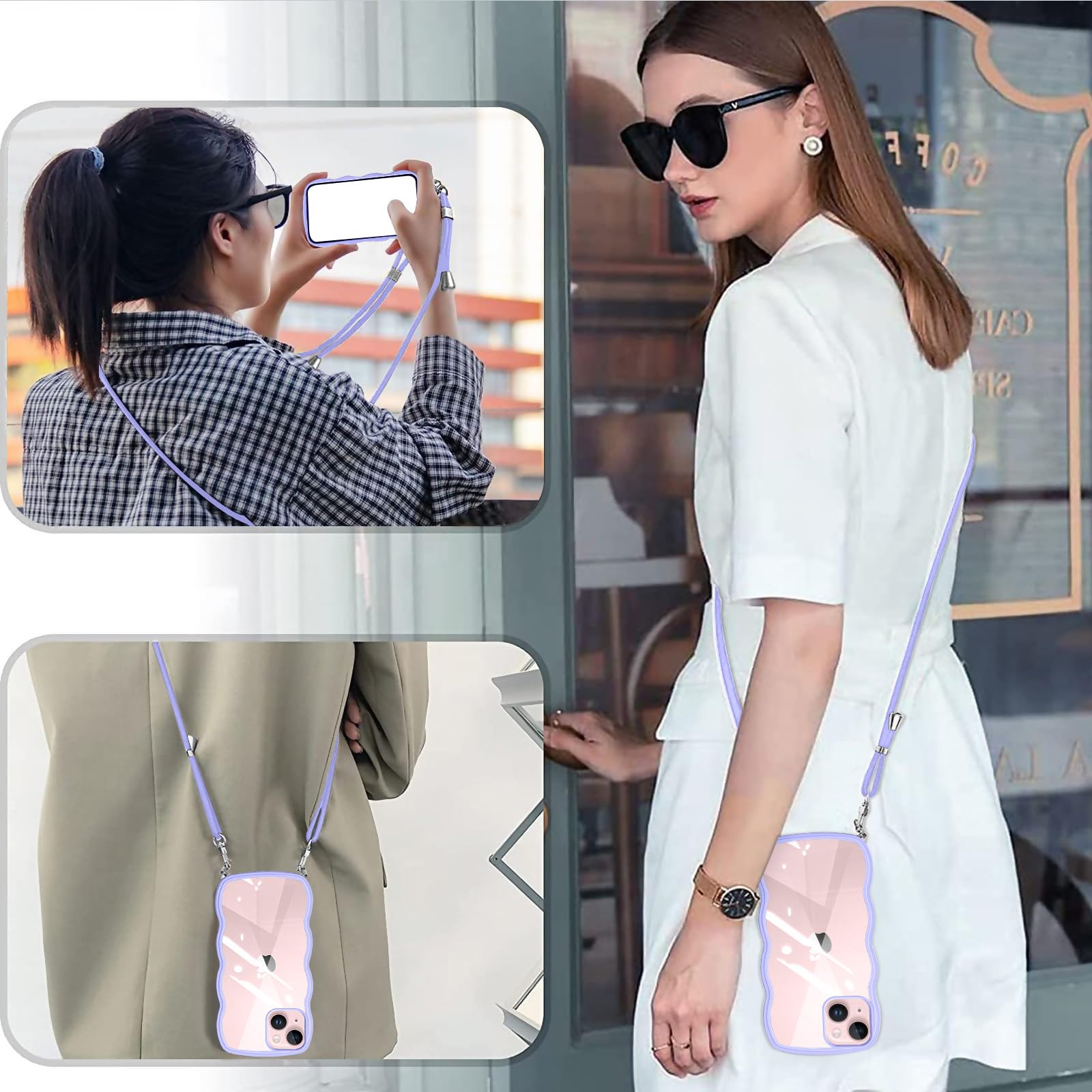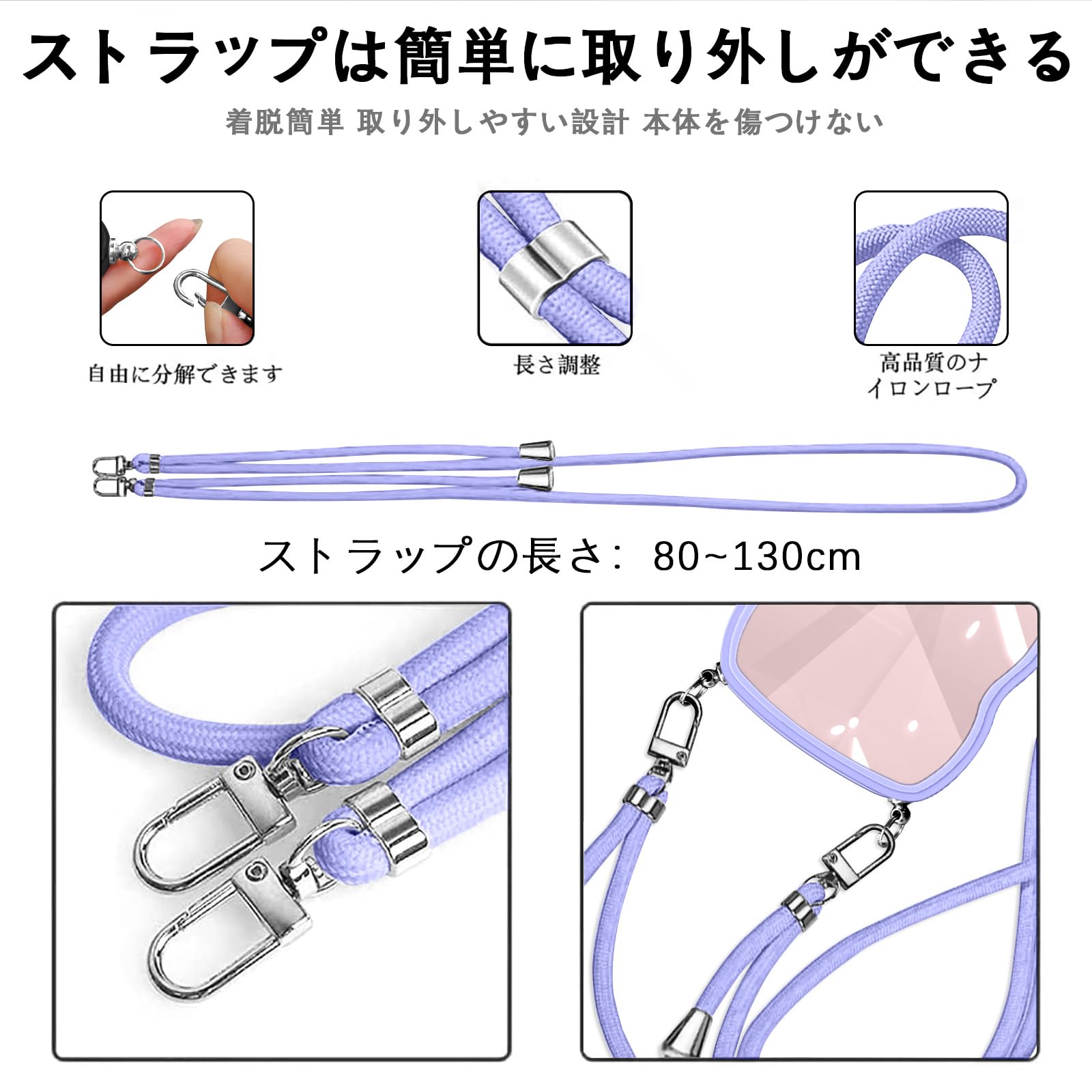 iPhone 15 用 ケース クリア ショルダー カバー 首掛け 肩がけ 斜めかけ 紐付き ストラップ付き iphone15ケース 韓国 可愛い かわいい 透明 薄型 軽量 耐衝撃 シリコン TPU バンパー アイフォン 15 スマホケース パープル