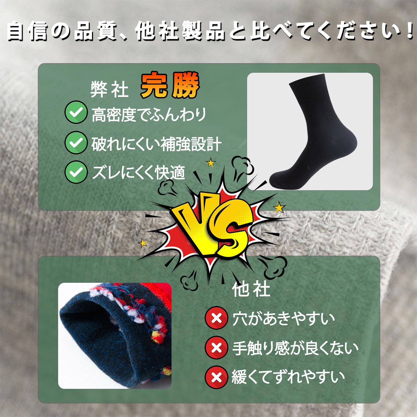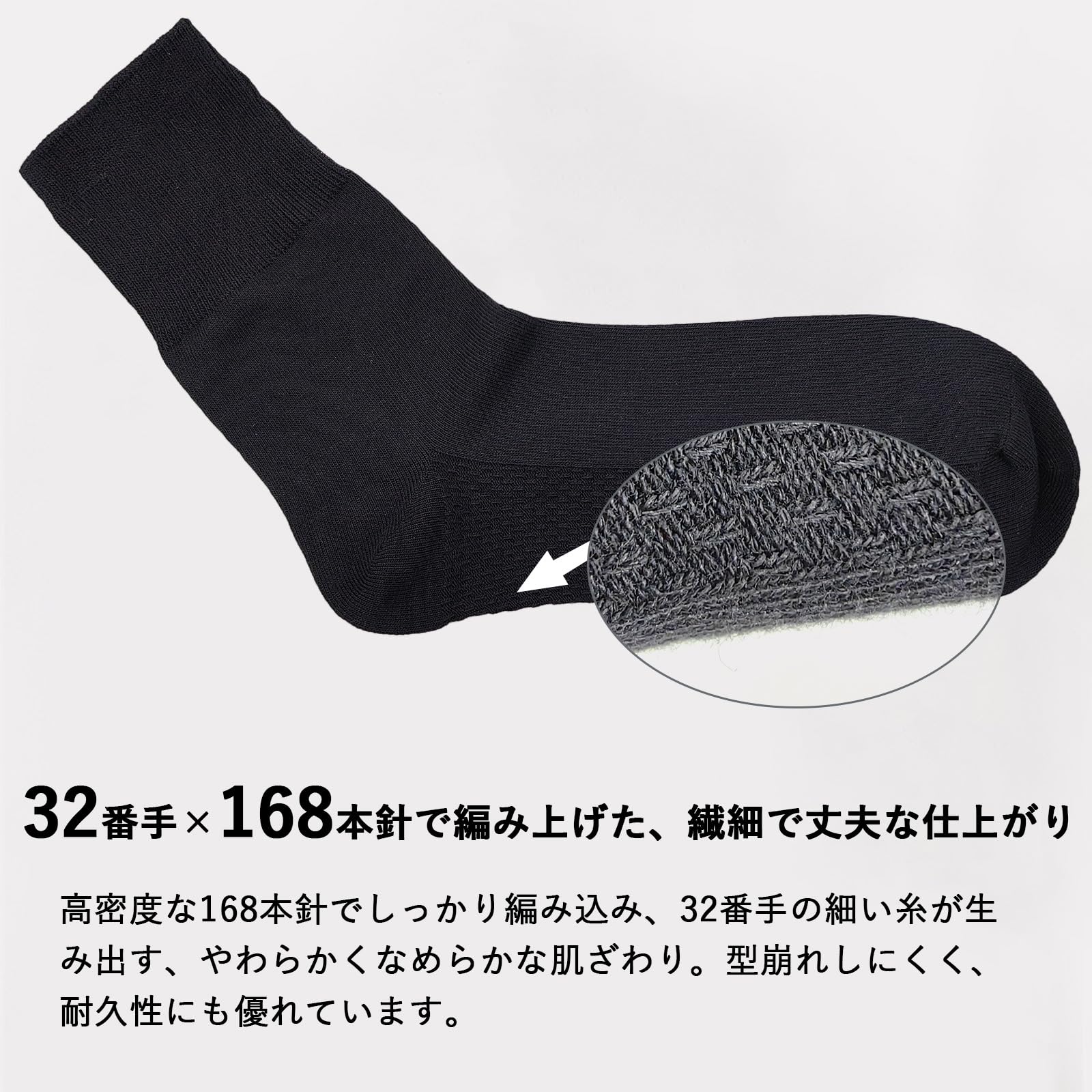 毛玉になりにくい高耐久素材 上質なコーマ綿を使用し、摩擦に強い仕様で毛玉が発生しにくく、洗濯後も形崩れしません。ビジネスソックスとしての耐久性を追求しています。