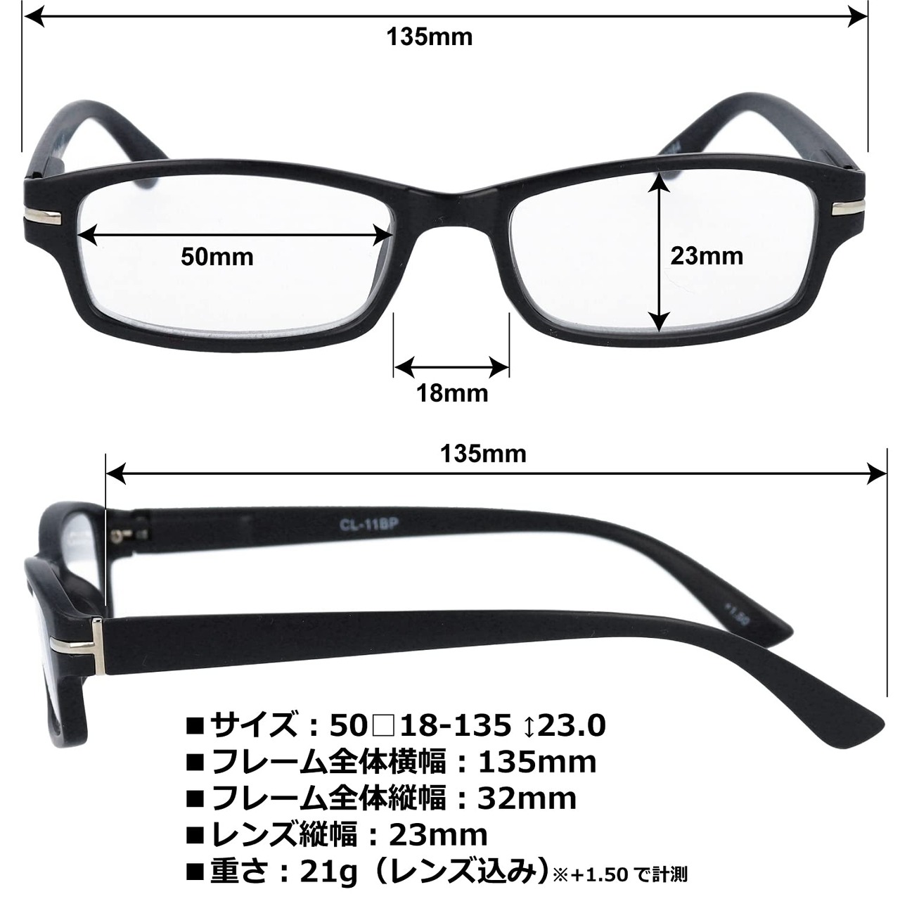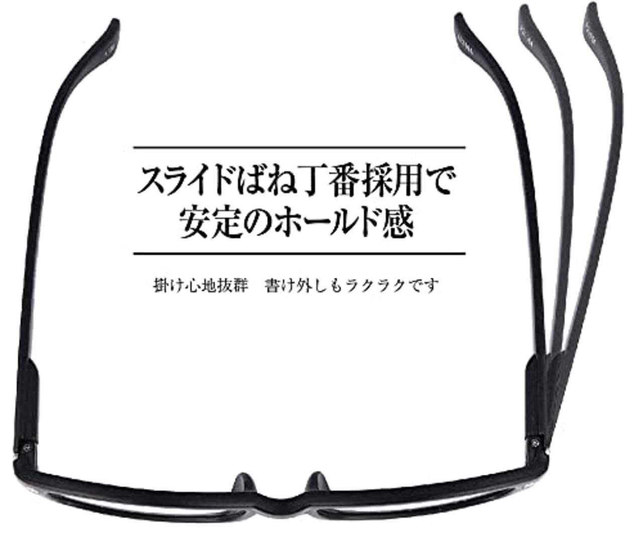【ソフトな掛け心地】軽量樹脂を採用しており、重さわずか21グラム。(+1.50で計測)普段メガネを掛けない方でも、鼻や耳が痛くなりにくく、違和感なく掛けていただけます。バネ丁番なので、つるがこめかみを圧迫することなく、柔らかい掛け心地であると同時に、程よいホールド感でお顔を包み込みます。下を向いてスマホやタブレットを使う時や新聞や本を読む時も、ズレ落ちにくく、快適にご使用いただけます。