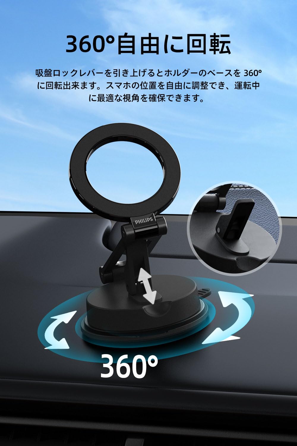 Philips (フィリップス) マグネット車載スマホホルダー magsafeホルダー 超強力吸着 真空吸盤 携帯ホルダー 多角度調整 360°回転な台座 車用ホルダー 折りたたみ式 片手操作 カー用品 全機種対応 DLK4131B