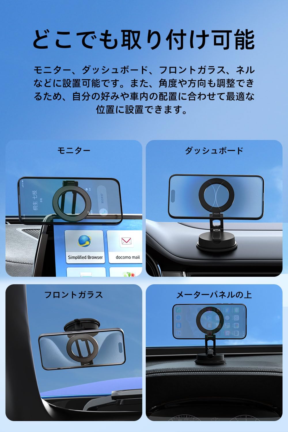 【数量限定】Philips (フィリップス) マグネット車載スマホホルダー magsafeホルダー 超強力吸着 真空吸盤 携帯ホルダー 多角度調整 360°回転な台座 車用ホルダー 折りたたみ式 片手操作 カー用品 全機種対応 DLK4131B | asaRulu0511