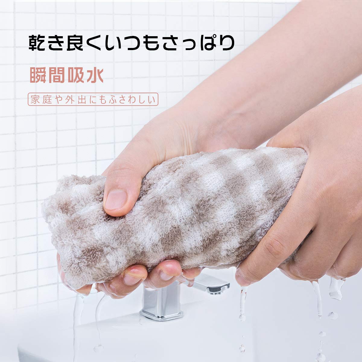 【4枚セット】4枚セットです。サイズ:約34㎝x70㎝。重量:約100g。ピンク、グレー、ブラウンの3色チェック柄を展開しており、無地タオルよりも区別が つきやすく、お好みに合わせて使い分けできます