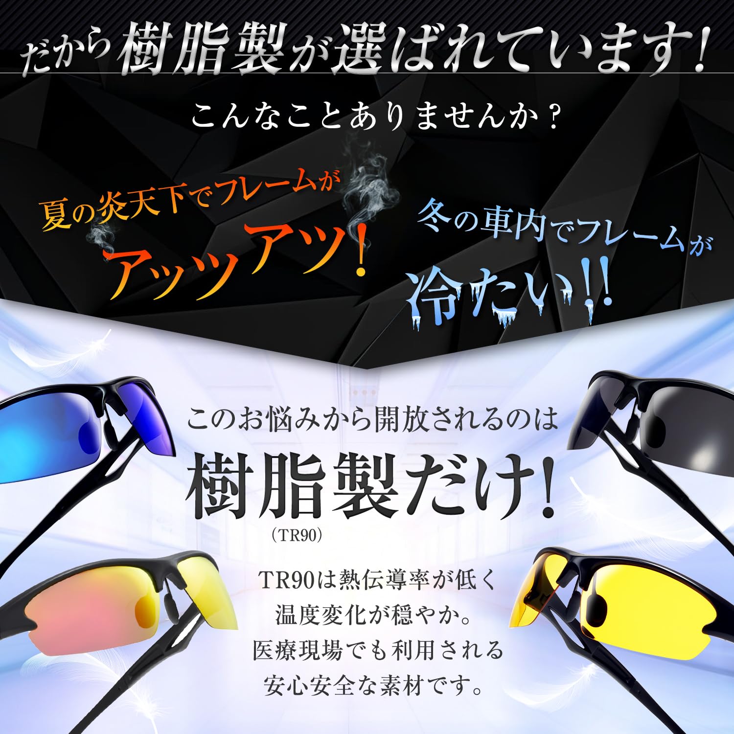 圧倒的クリアな視界!雨や雷、雪、曇りの日の日差しをシャットアウトし、路面や水面、雪面からの照り返しを軽減。運転や釣り等でガラスやギラギラを効果的にカットし、クリアで快適な視界を提供します。夕方・夜間におすすめのレンズでは、街灯や対向車のライトの眩しさをカットし、遠くも近くもスッキリとしたクリアな視界となります。