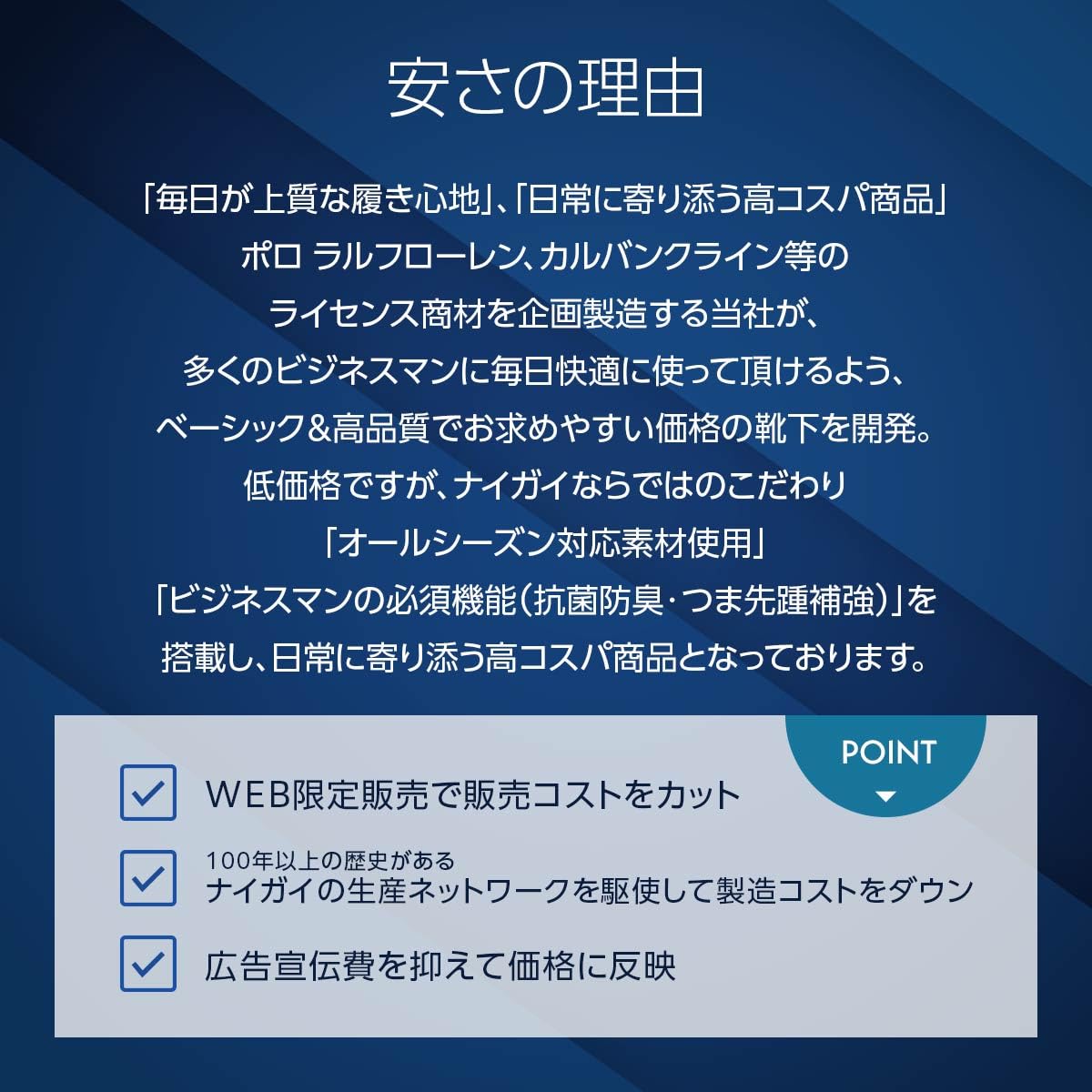 ナイガイならではのこだわり「オールシーズン対応素材使用」「ビジネスマンの必須機能(抗菌防臭・つま先踵補強)」を搭載し、日常に寄り添う高コスパ商品となっております。