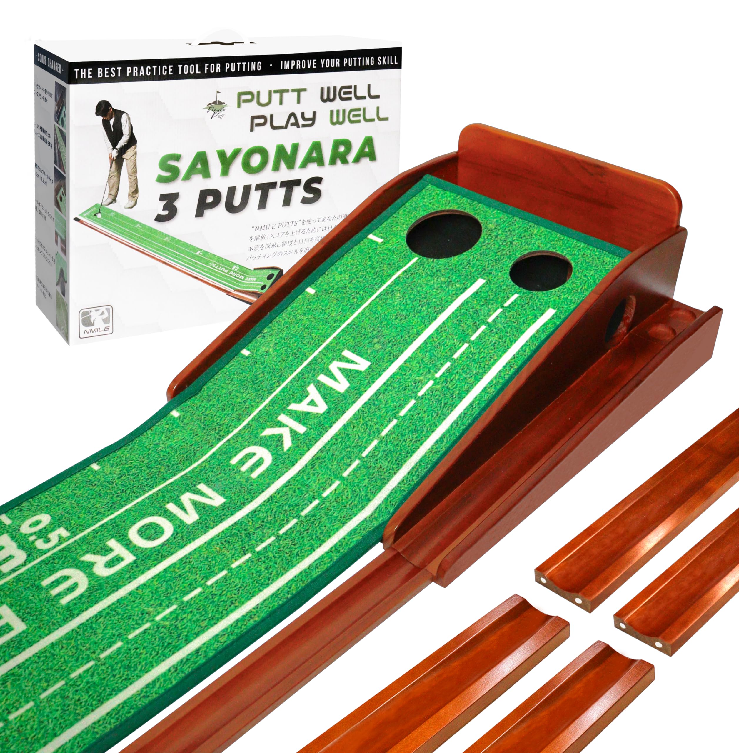 nmile(エヌマイル)のリターン式パターマット! マットはスウェード生地でリアルで滑らかな転がりを再現。 返球レールやその他の素材は高級感溢れる木材を使用。 定位置から動かず何度も何度も効率的に反復練習することで3パットとはもうおさらば!
