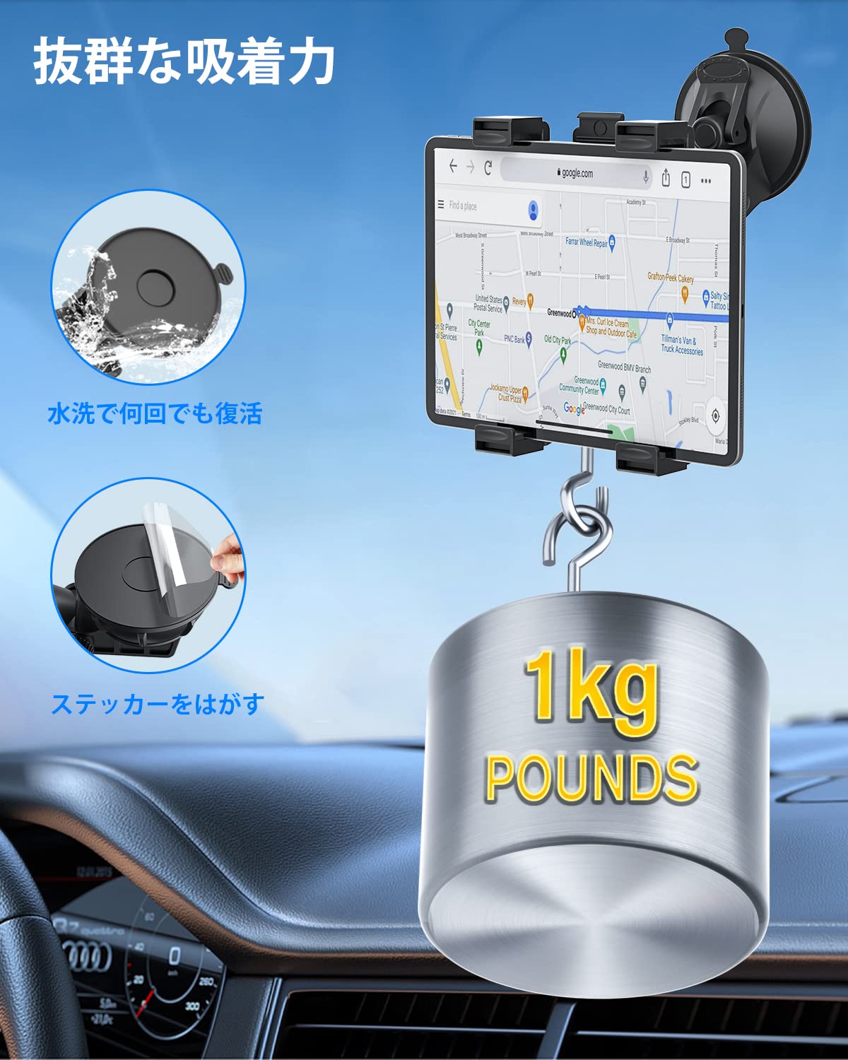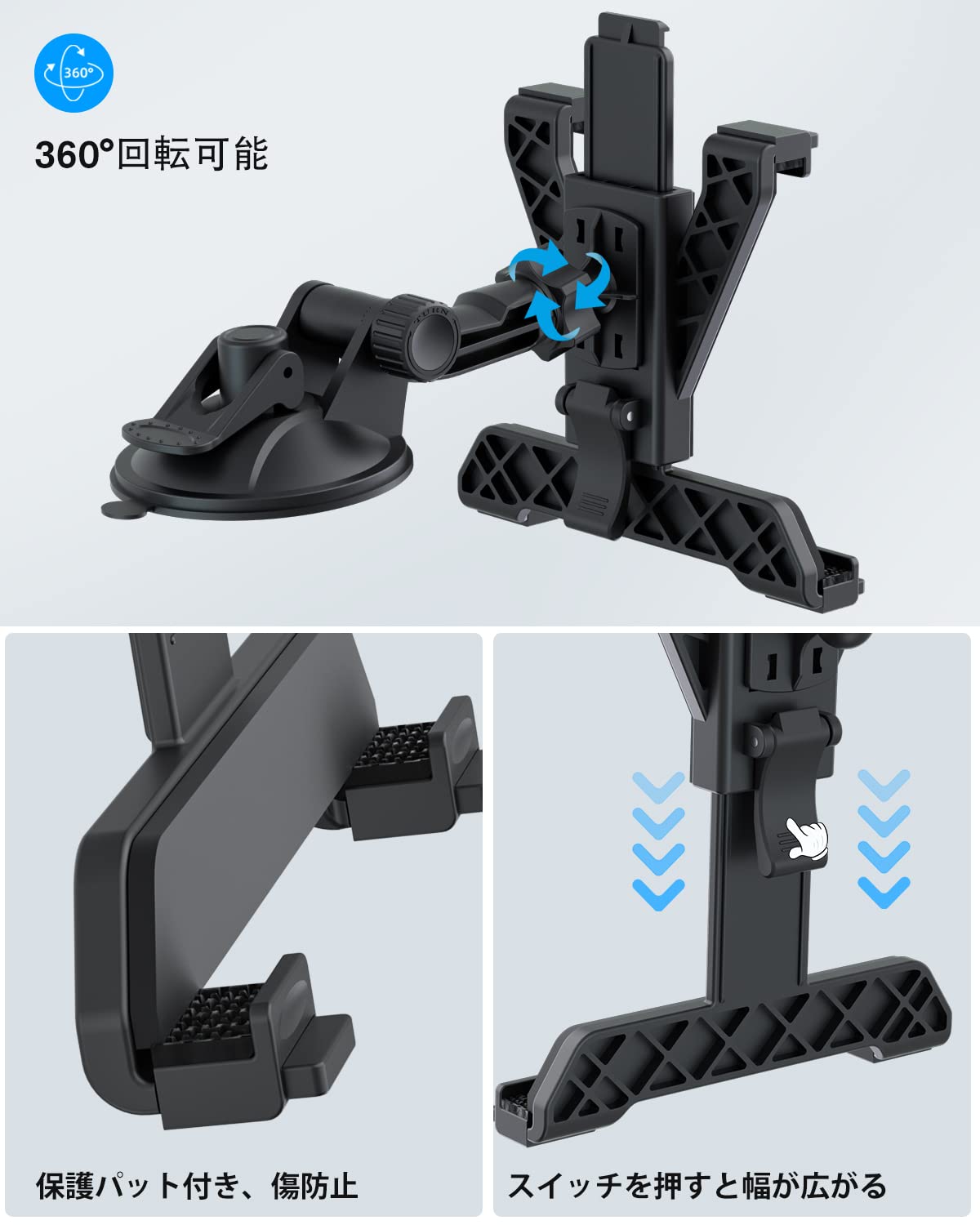 【7-10.5インチのタブレットに対応 タブレット車載ホルダー】このタブレットホルダーは上下支持部の長さが約11~21CM、下の短辺が約10CM、爪の厚さが最大約1.6CMです。(2〜3mmの誤差は正常です)購入前に上記のデータを参照してください。ipad/ipad mini/ipad air/kindle/Galaxy Tab/ Fire HD 10など端末に対応できます。