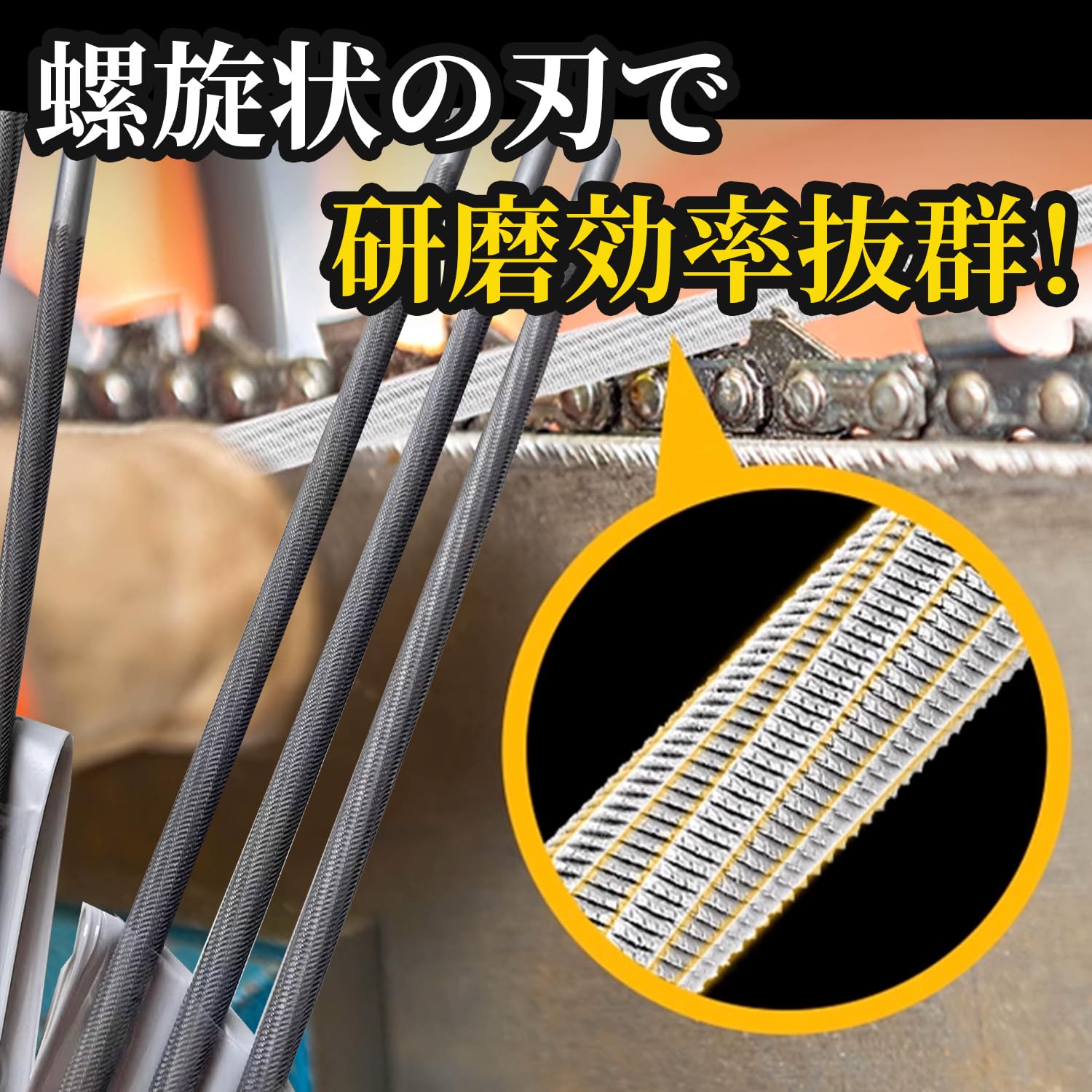 木材を伐採するソーチェン(ソーチェーン)部分を研磨する棒ヤスリ部分をまとめ売りしています。消耗していくやすり研ぎ器部分です。マルヤスリをストックを持つことをおすすめします。