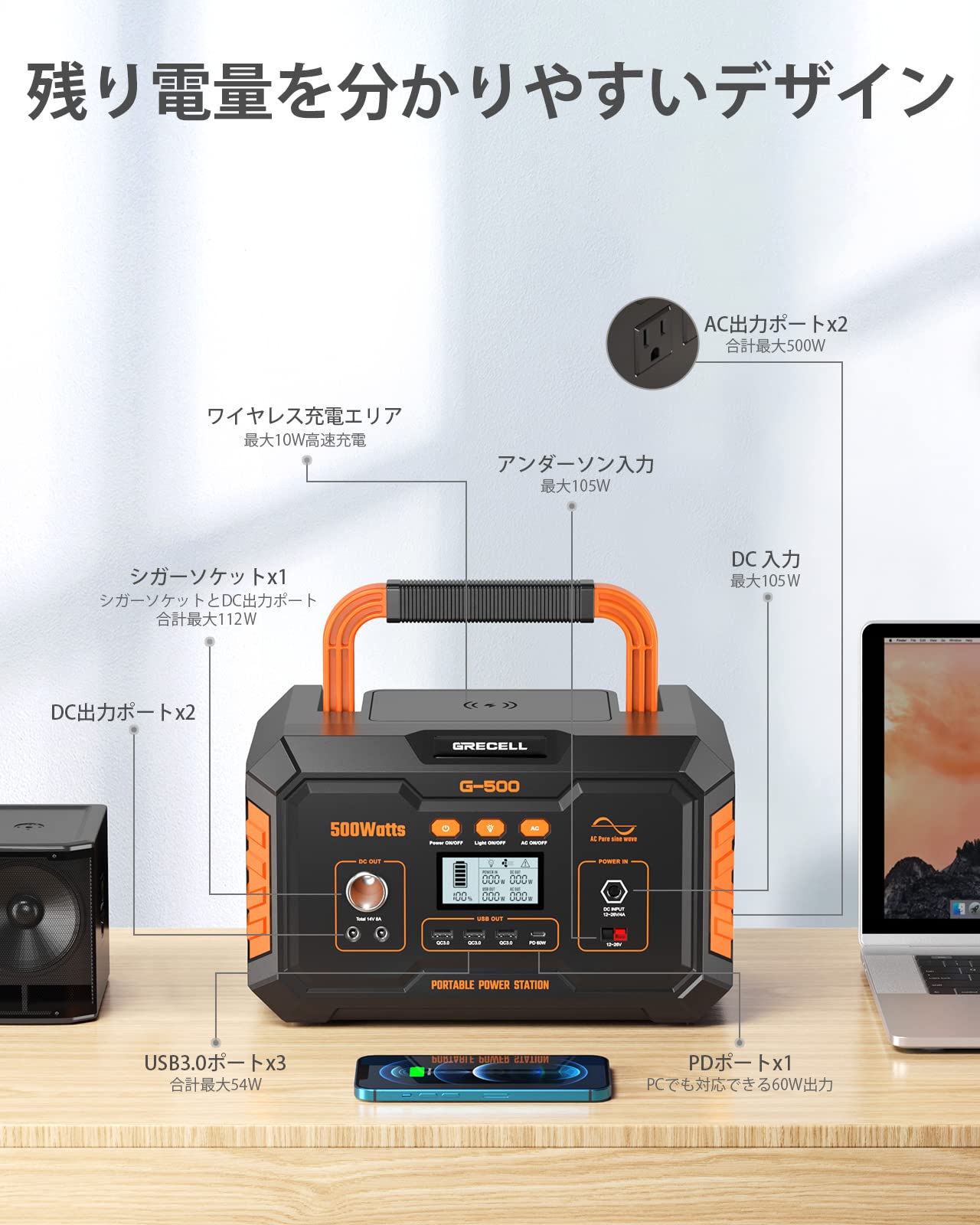 ポータブル電源 大容量 500W GRECELL 140400mAh/519wh ポータブルバッテリー 純正弦波 MPPT制御方式採用 家庭用蓄電池 PSE認証済 ワイヤレス充電搭載 10台デバイス同時充電 PD60W急速充電USB-C/USB-A 合計四ポート出力 AC(瞬間最大1000W)/DC出力 車中泊 キャンプ アウトドア 地震停電対策 防災グッズ LED/SOSライト付き 非常用電源