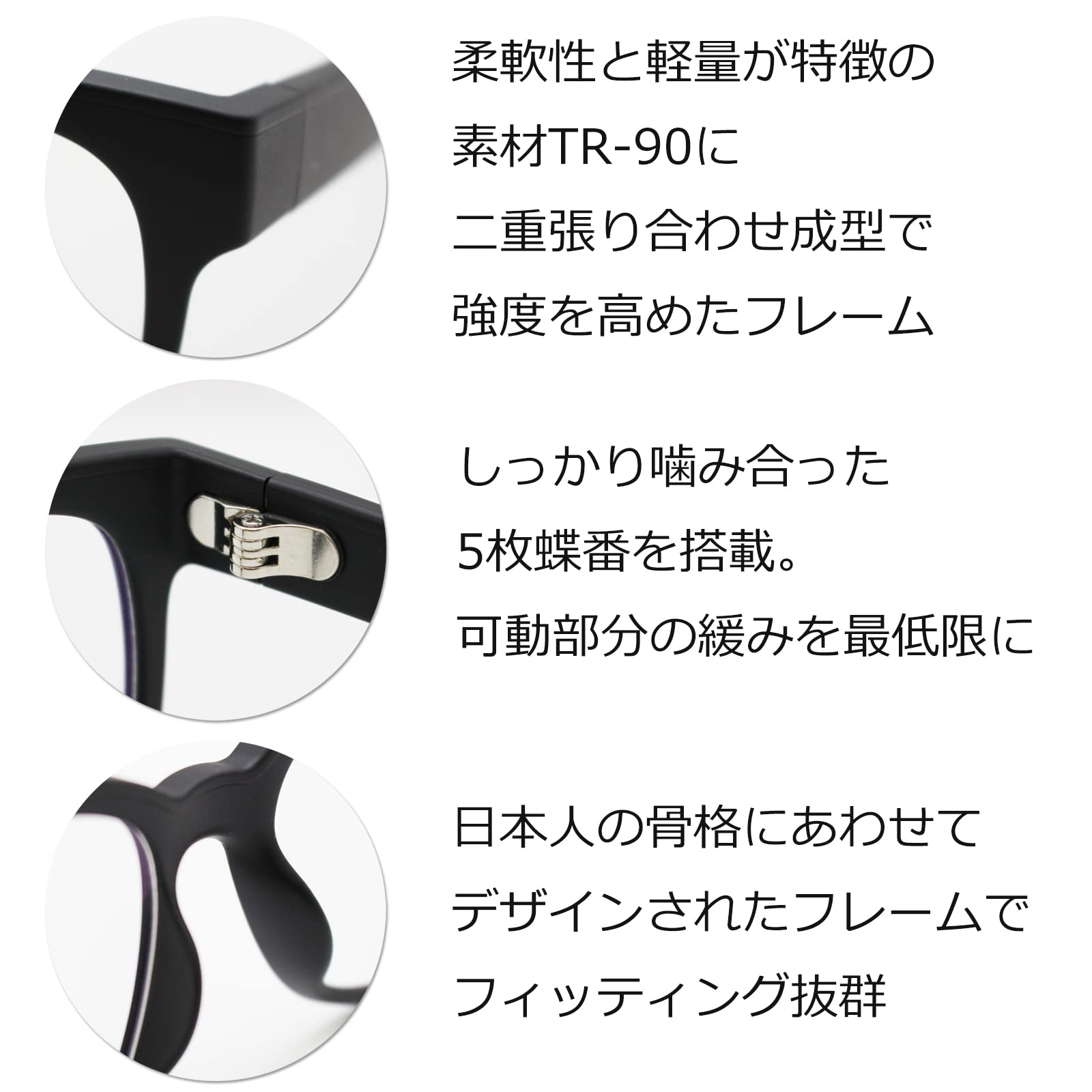 フレームには宇宙開発でも使用される軽くて柔軟性のある素材TR-90を使用。日本人の骨格に合わせて設計したフレームの為、フィット感抜群。軽量設計で長時間かけても負担が少なく、ズレにくいのが特徴です。男女兼用のおしゃれなフレームです。