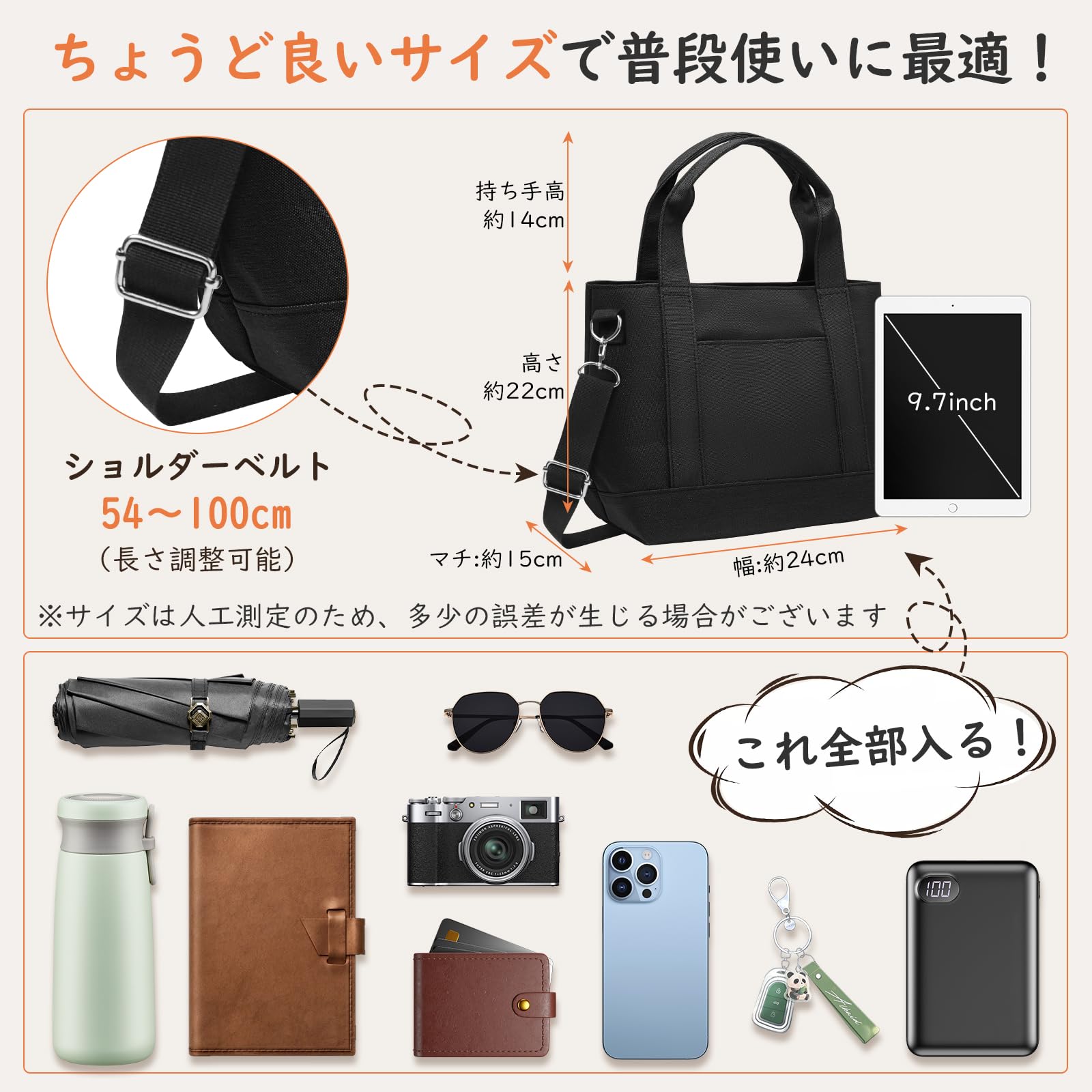 【商品特徴--小物類は移動にくい&商品仕様】仕切りを底までポタンで繋げて小物類は移動にくくて、肩にかけることも手で持つこともできる2way小さめトートバッグです。きれいに仕分けできる上、優れた収納力を持ち、軽量で持ち運びにも便利、デイリー使いにも、お出かけにも使えるショルダーバッグです。【商品仕様】製品サイズ:高さ22cm×幅24cm×マチ15cm 持ち手の高さ:14cm ショルダーベルトの長さ:54~100cm(長さ調整可能)■本体重量:約390g 外ポケット:1 内ポケット:3つの仕切りデザインと合計6つの収納ポケット
