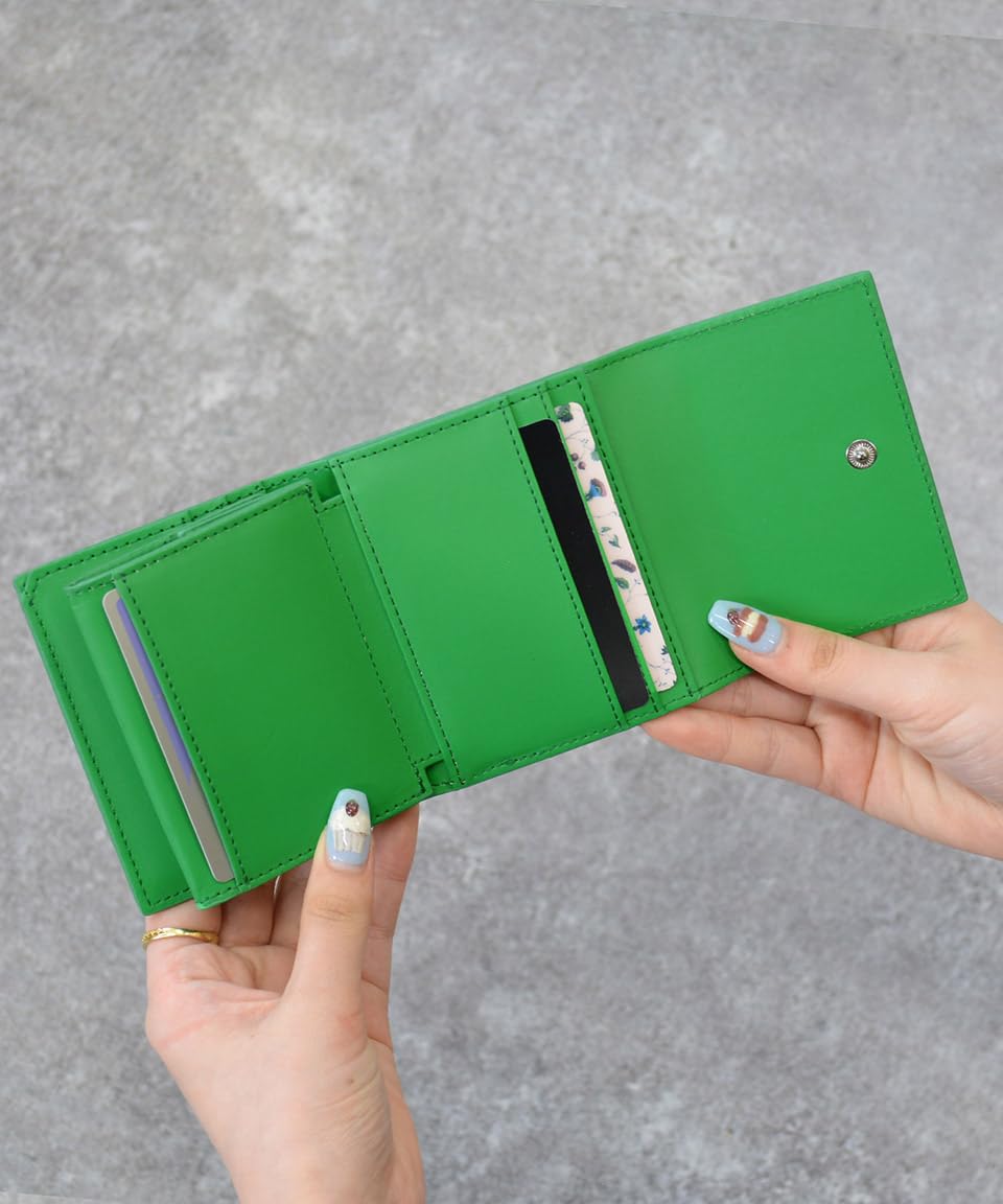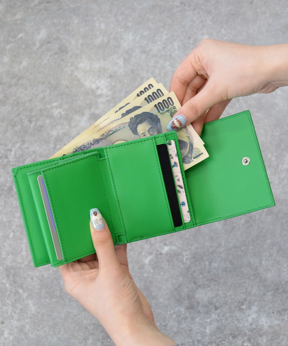 内側の小銭入れは、見やすく取り出しやすいボックス型。縦からも横からも出し入れできる札入れで、支払いもスマート。内側のカードポケットは7つあり、見た目以上の収納力もポイント。片手に収まるちょうどイイサイズ感で、小さめのバッグにもぴったり。フリップ式の小銭入れなので、カードの出し入れも簡単。デイリー使いから旅行やちょっとしたお出かけに大活躍。