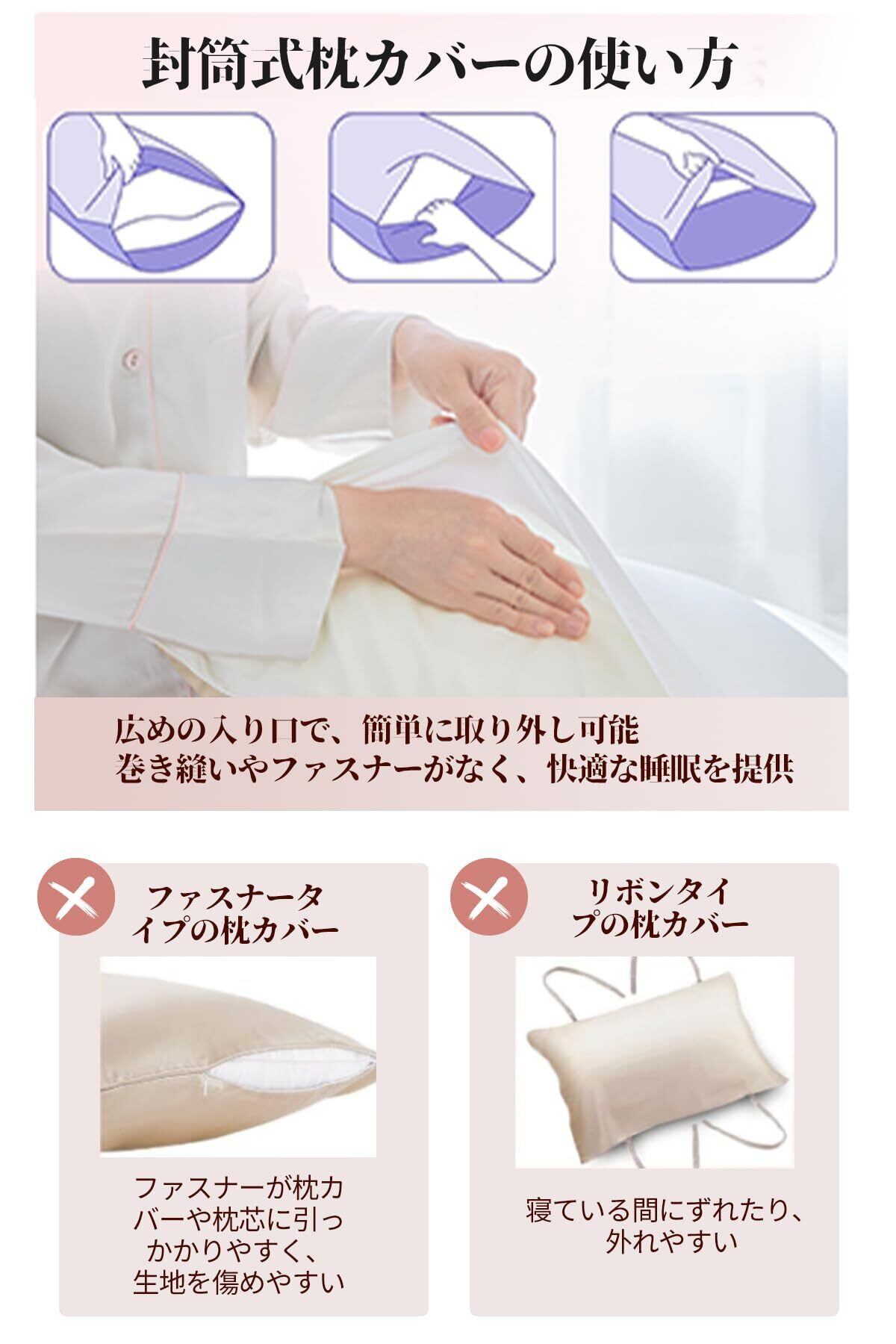 【滑らかで柔らかい質感、高い快適さ】 私たちのシルク枕カバーは、天然シルクで作られており、コットンよりも柔らかく、肌に優しいのが特徴です。特に女性は生地の柔らかさを重視するため、この高品質なシルク枕カバーは最適な選択です。吸湿性、放湿性、通気性にも優れており、コットン枕カバーよりも吸湿性と通気性が高いため、より快適にお使いいただけます。