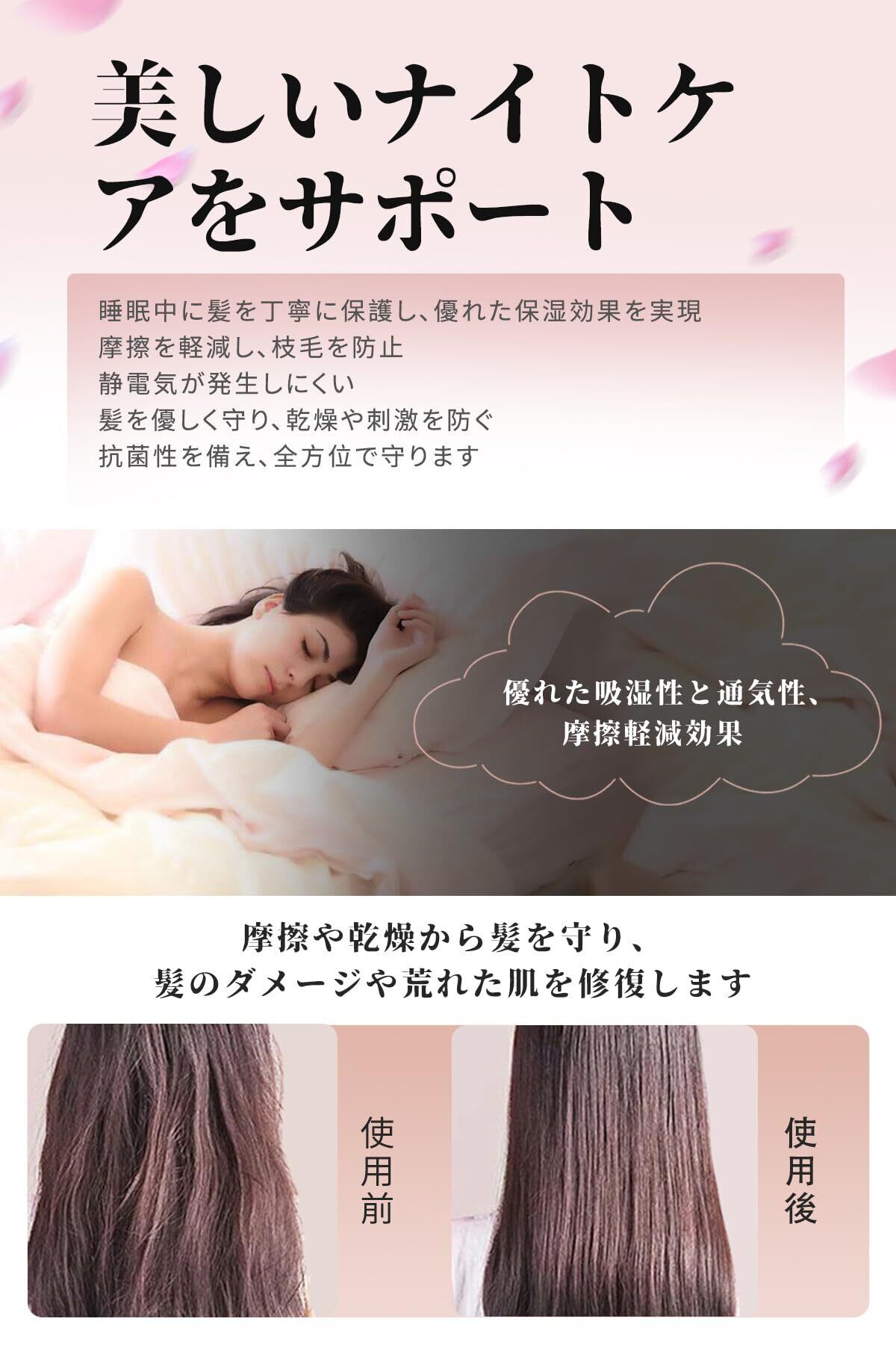 【髪のダメージを防ぎ、肌や髪に優しい】 寝返りを打つたびに、枕との摩擦で髪がダメージを受け、切れ毛や絡まりが発生することがあります。しかし、シルク枕カバーの滑らかで柔らかい質感は、この問題を解決し、髪を摩擦からしっかりと守ります。シルク枕カバーは高い保湿性を持ち、髪に潤いを与えてくれます。さらに、吸湿性と放湿性にも優れ、天然のタンパク質と人間の皮膚に近いアミノ酸を含んでいるため、敏感肌の方や赤ちゃんにも安心してお使いいただけます。