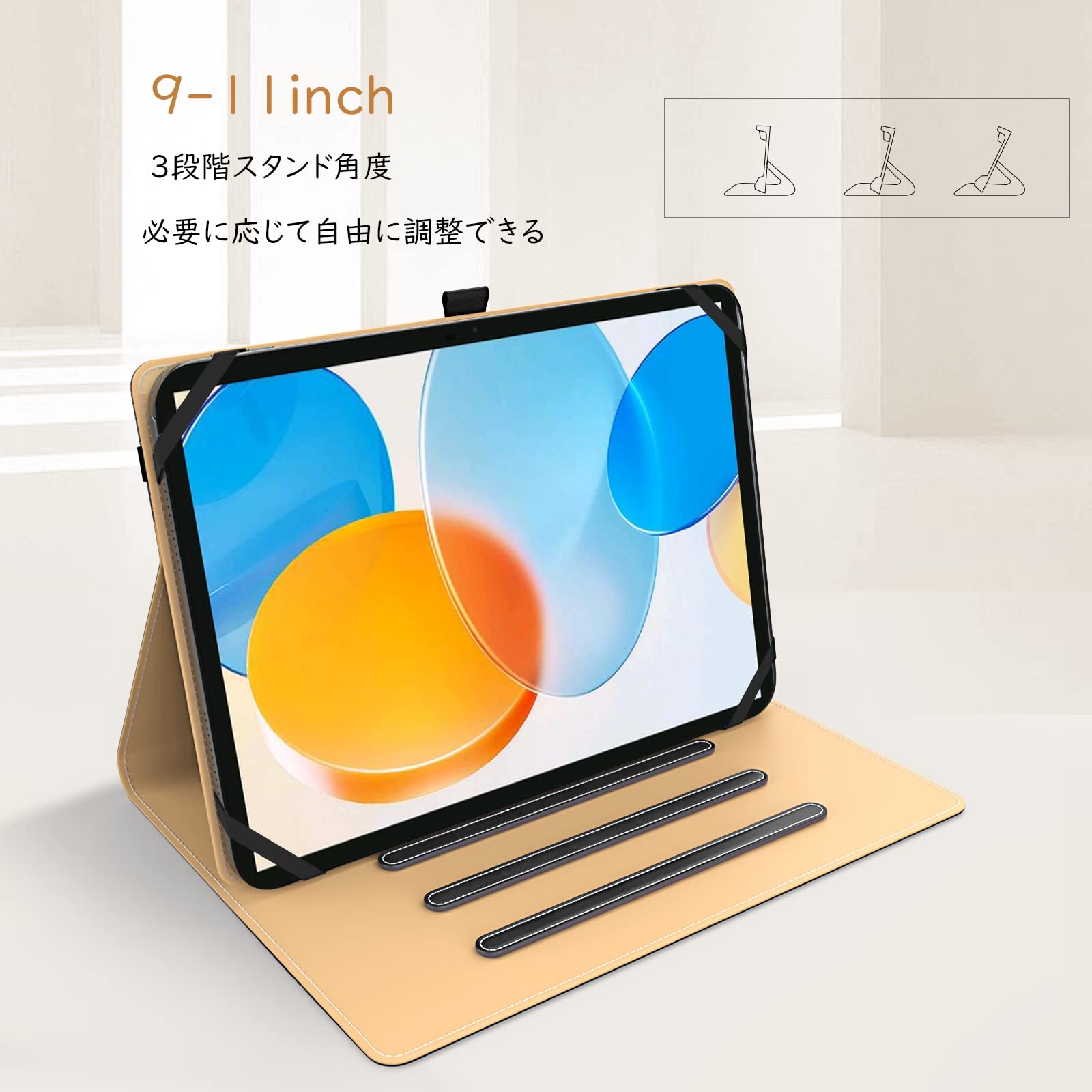 「9~11インチタブレット対応」 当商品は9~11インチのタブレットに適用の汎用ケースです。タブレットの四角をカバー裏面の四角に相応のゴムバンドで引っかけることで装着するタイプで、取り付けは非常に簡単です。ご注意:本製品の内寸は24.5x17cmになります。メーカーによって同じ画面サイズのタブレットでも外寸は異なる場合がございますので、ご購入の前にお手元のタブレットの外寸を予めご確認ください。