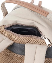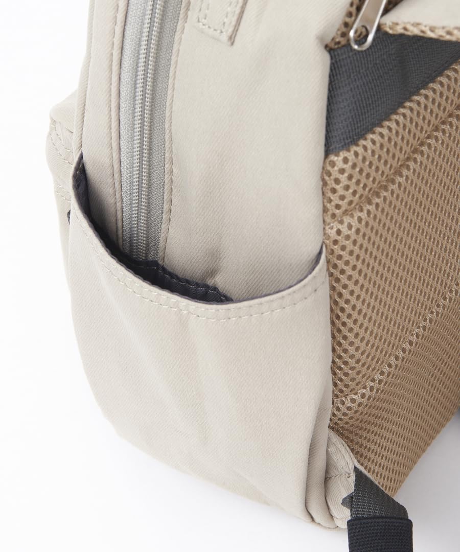 「持ちやすさ」にこだわった、女性のためのラウンドバッグ。丸みのある優しいかたちで、気分も雰囲気も柔らかく。ふんわりとしたツイル生地で、ナチュラルかつ上品な見た目に。さっと持ちやすい、もちっとした合皮ハンドルがポイント。背面のファスナー付きスマホポケットなど、使いやすさと見た目の可愛さを兼ね備えたミニリュック。少し広がったデザインのサイドポケットがポイント
