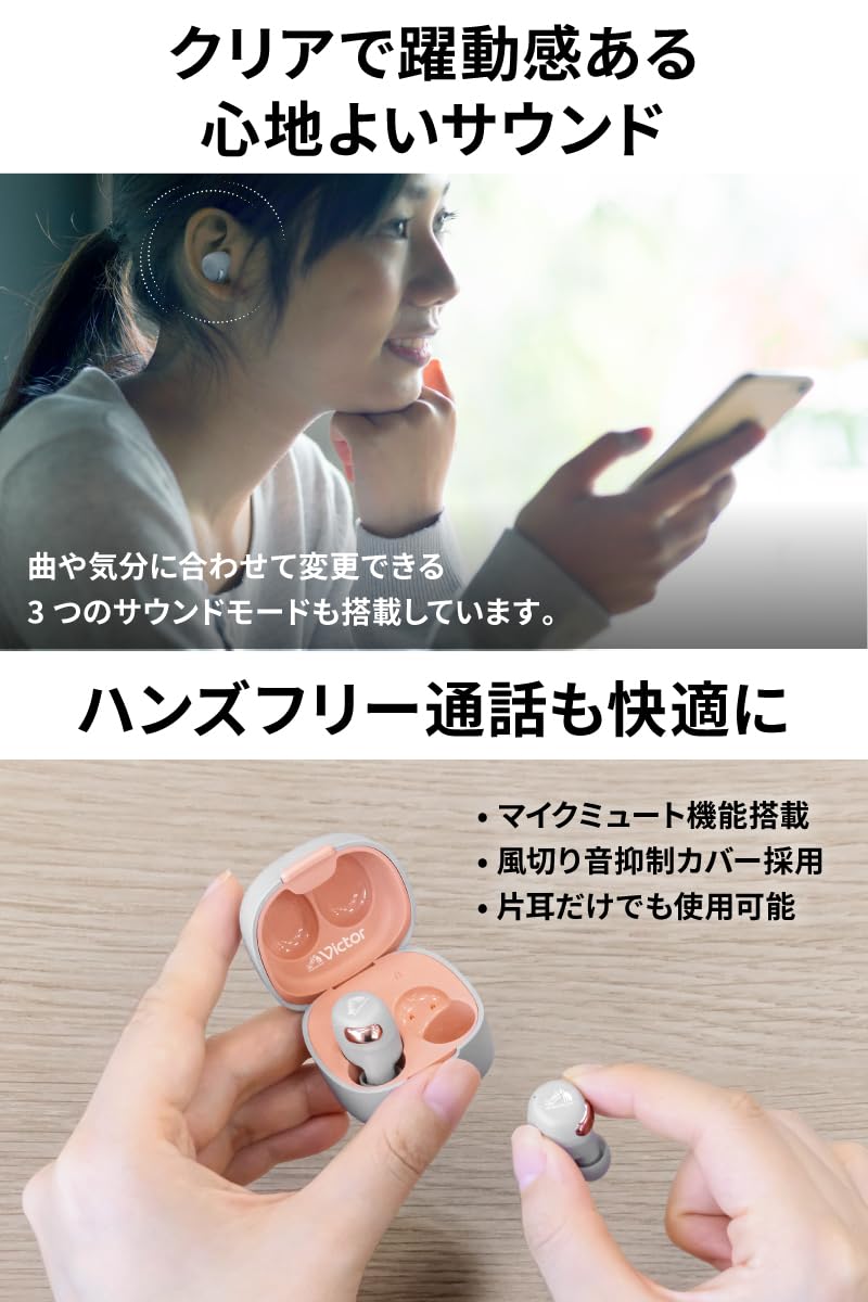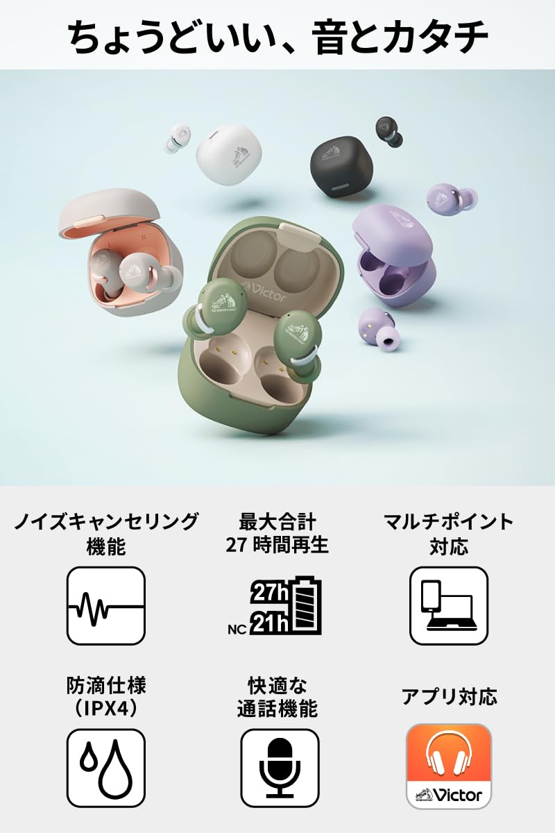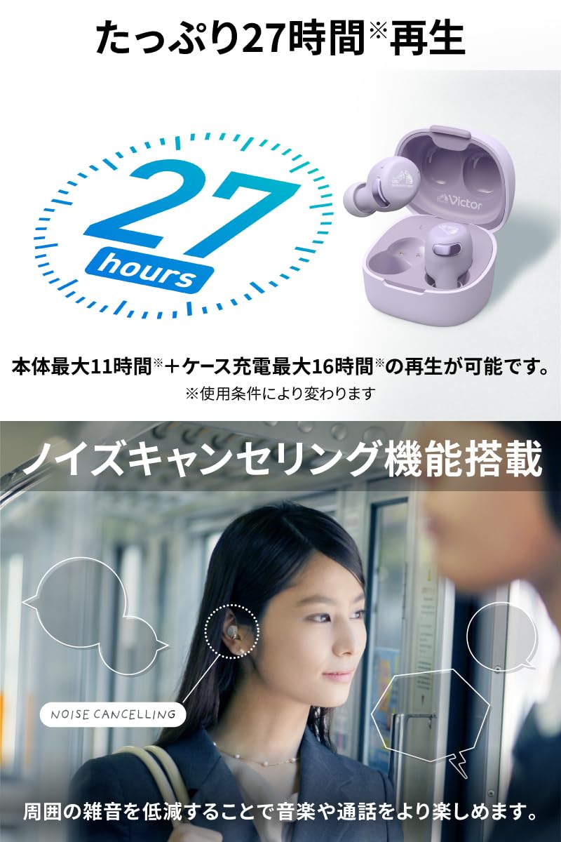【数量限定】JVCケンウッド Victor HA-A30T2-V ワイヤレスイヤホン Bluetooth Ver.5.3 ノイズキャンセリング アプリ対応 マルチポイント 合計27時間再生 マイク付き 小型 軽量 外音取り込み 防水 パープル | asaRulu0511