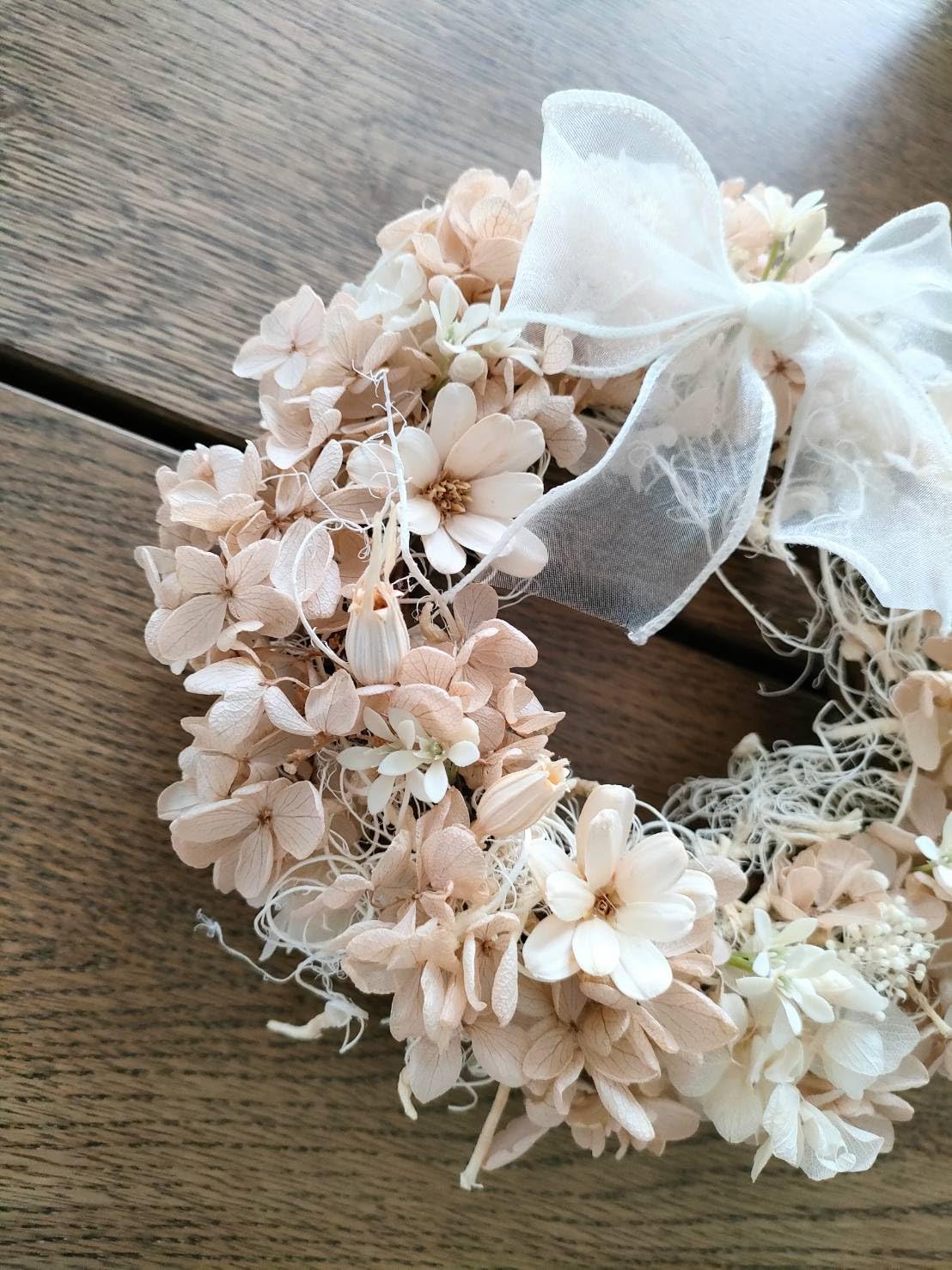 オフホワイトのカーリーモスにシャンパンカラーの紫陽花に可愛い小花を、散りばめた、ナチュラルなリースになります。