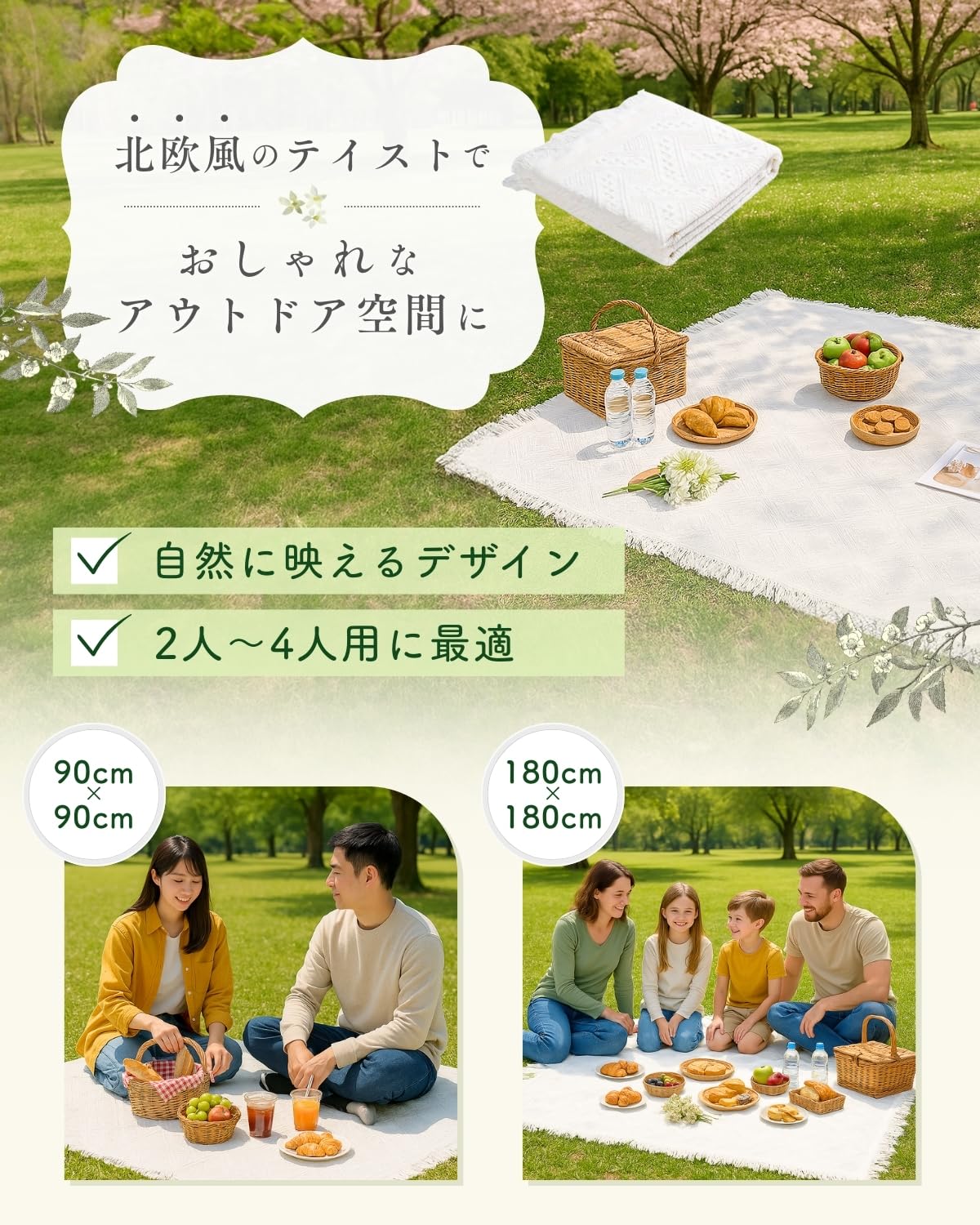 【写真映えするレジャーシート】サイズは2種類からお選びいただけ、いずれも1~4人用です。使いやすく、ピクニックやアウトドアで大活躍します。