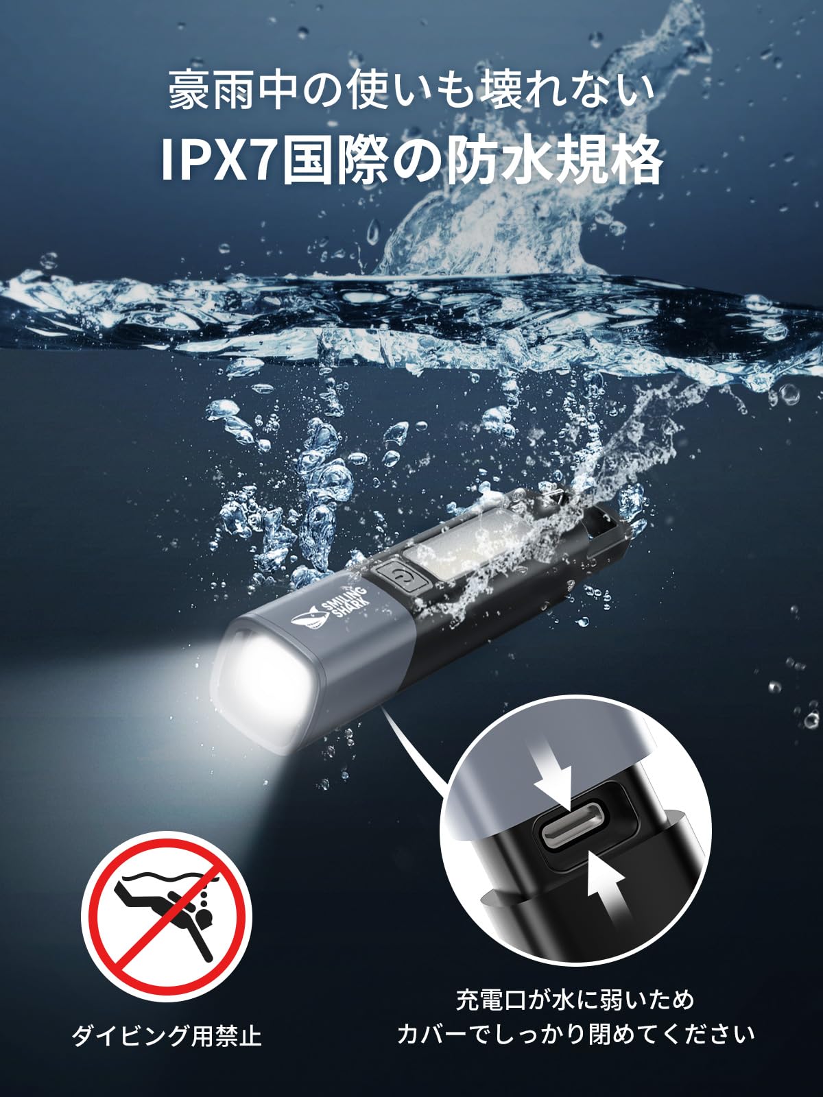 【耐久性・IPX7防滴仕様】防水等級IPX7に準拠しているため、懐中電灯本体が風雨などの悪影響を受けることはありません。夜に自転車、散歩、キャンプ、アウトドア時に突然の暴風雨を心配する必要はありません。