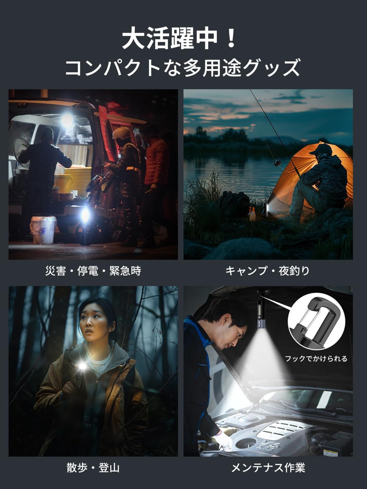 【携帯便利】コンパクトで軽量、片手で簡単に操作でき、バッグやポケットにも収まります。ポケットやカバンに入れて、持ち運びやすいです。日常使用やキャンプ、ハイキング、登山、サイクリング、散歩、救援活動、避難など様々なシーン に適しています。さらにフック付きでアウトドア時の持ち運びも便利です。
