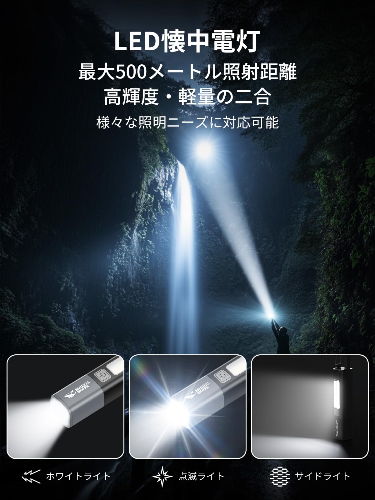 【高輝度照明モード】LEDハンドライトは高輝度XPE LED電球を搭載しており、最大照射距離は500メートルに達します。ホワイトライト、点滅ライト、サイドライトという三つの照明モードがあり、様々なニーズを満たす十分な照明を提供します。