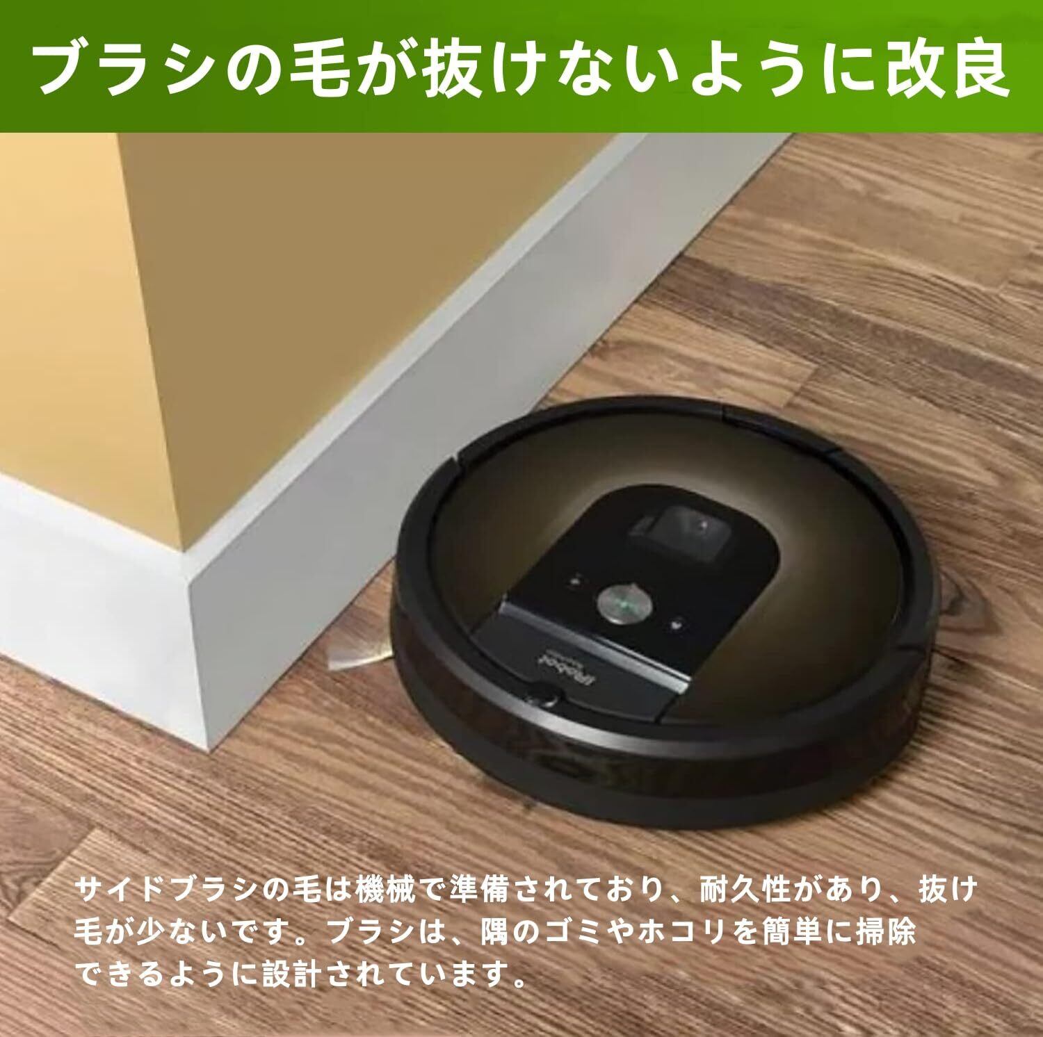 【高品質】純正品と変わらない品質でエッジブラシの毛が抜けないように改良しました。壁際や部屋の四隅のゴミを回転しながら、前方へかき出すためのルンバ用エッジクリーニングブラシです。