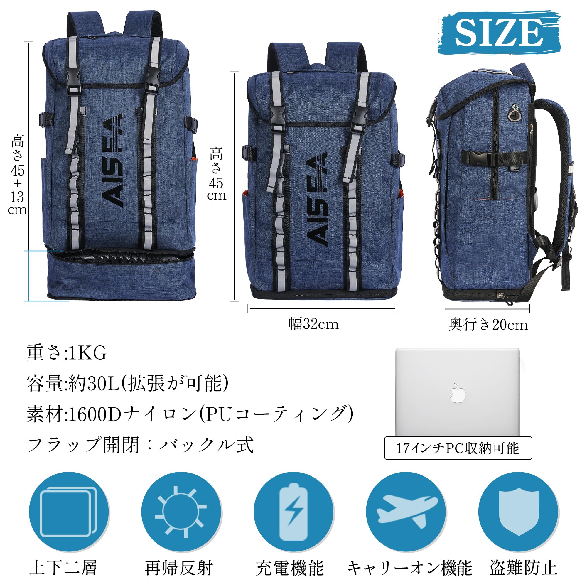 【上下二層構造】AISFA独創的な上下二層構造の設計です。収納スペースが上下に分かれた2層式タイプです。大容量リュックの下層ポケットは防水のEVA材質なので、靴やお弁当、濡れた傘を収納できます!特に梅雨に最も効果的です。