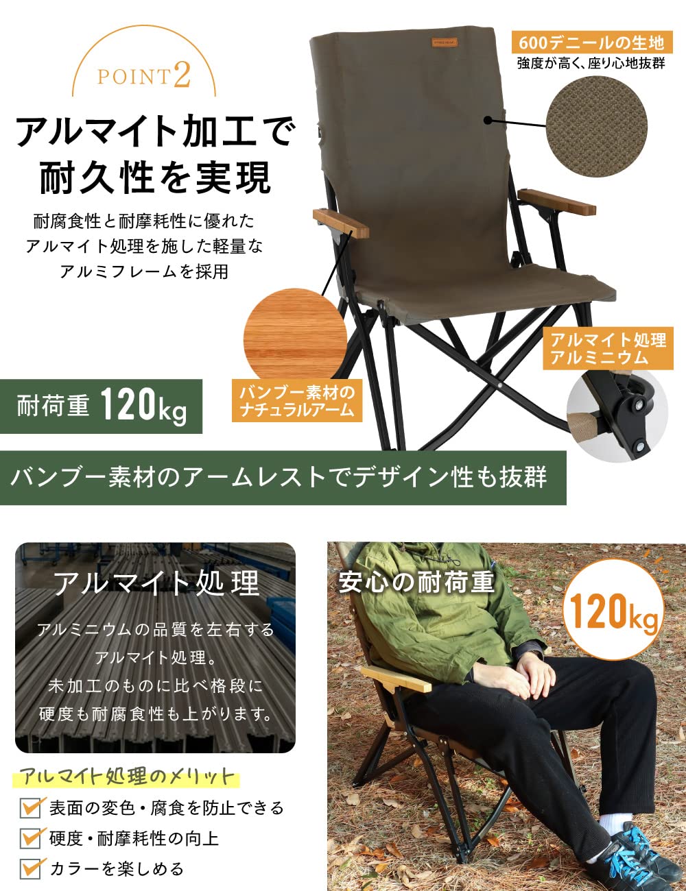 【自分スペースもアウトドアに】デザインと機能性にもこだわりました。背面には幅広のポケット、肘掛けはバンブー素材でナチュラル感があり、ベランダなどでのんびりするなどアウトドア以外のシーンでも活躍します。