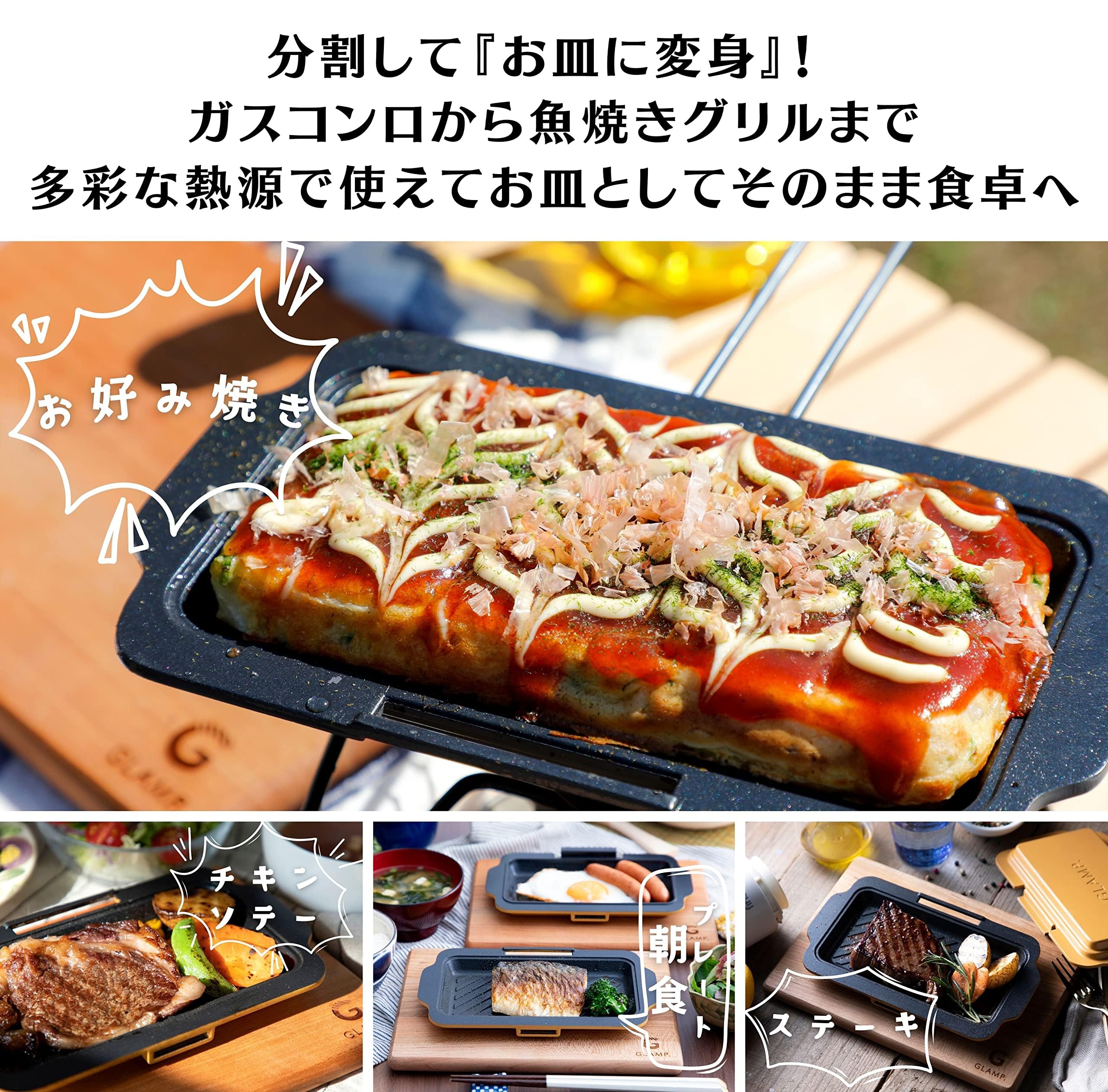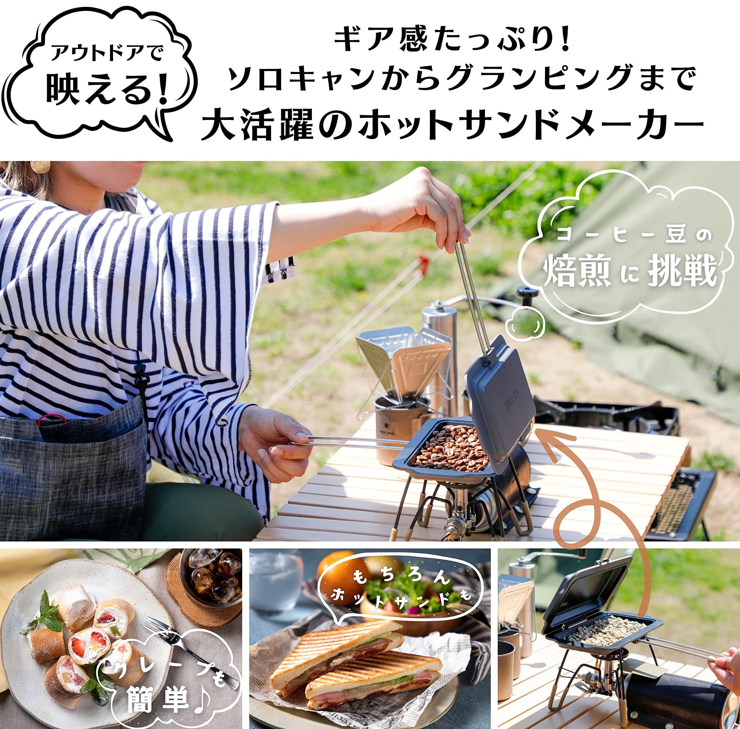 【アウトドアで活躍するクッキングプレート】 GLAMP.ホットサンドディッシュは取手を外して持ち運びが簡単。 GLAMP.ホットサンドディッシュは蓋ができます。 蓋をして焼くことで通常よりも倍近い速さで火が通ります。 外ではつくりにくい料理や火の通りにくい鶏肉、魚、ハンバーグなどの料理にも挑戦できます。 GLAMP.ホットサンドディッシュはコーヒー豆の焙煎もできます。 蓋をして中火で火から15cm程離して振りながら、 一爆ぜしたらひっくり返してさらに10分程度で出来上がりです。