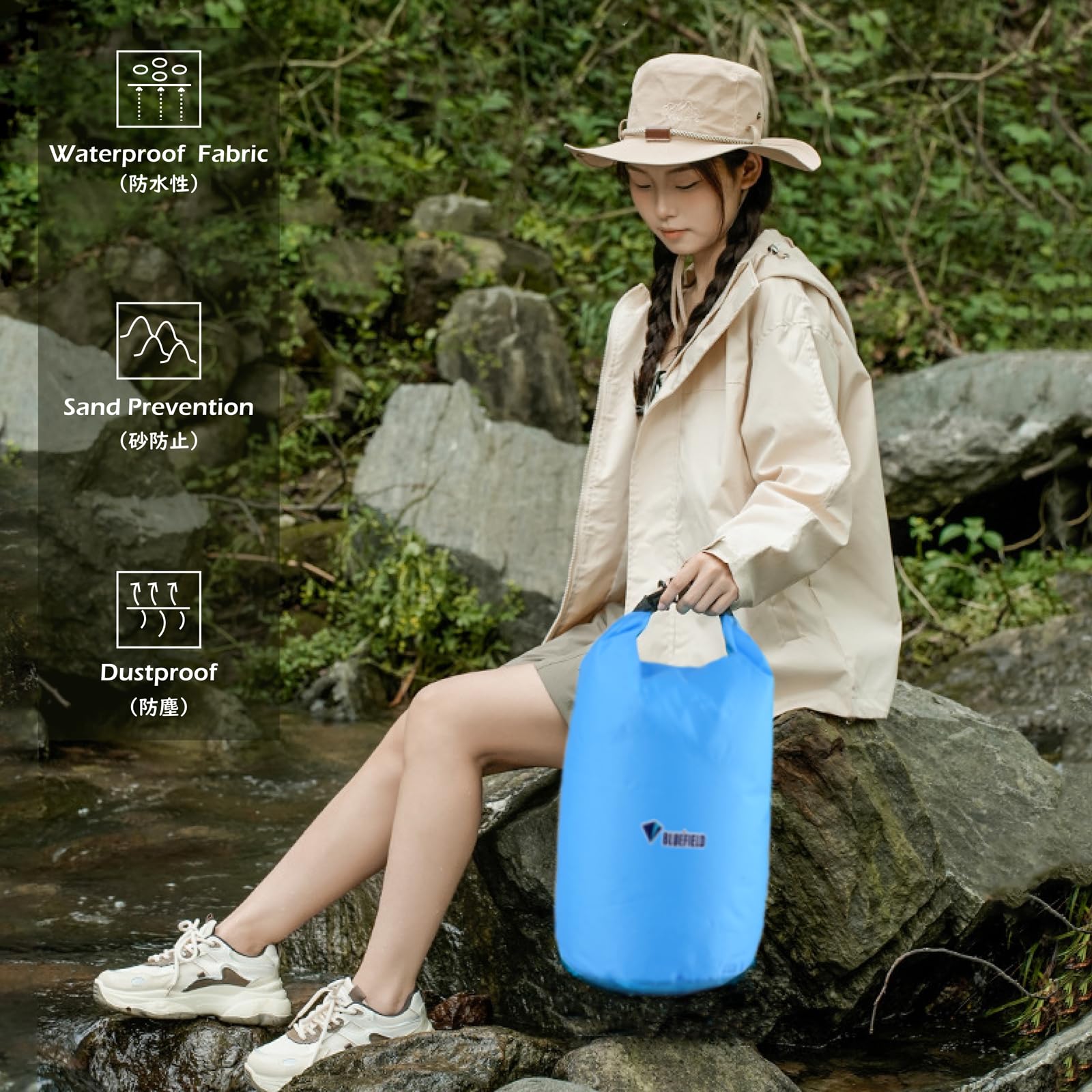 【使い方】①開口部を揃えて下さい。②開口部を折りたたんで下さい。③3~4回折り曲げて下さい。④バックルでワンタッチロックするだけで簡単にお使い頂けます。️ご注意 -- ビーチバッグは防水性に非常に優れておりますが、100%の防水性は保証できかねますので、潜水状態で使用しないでください!