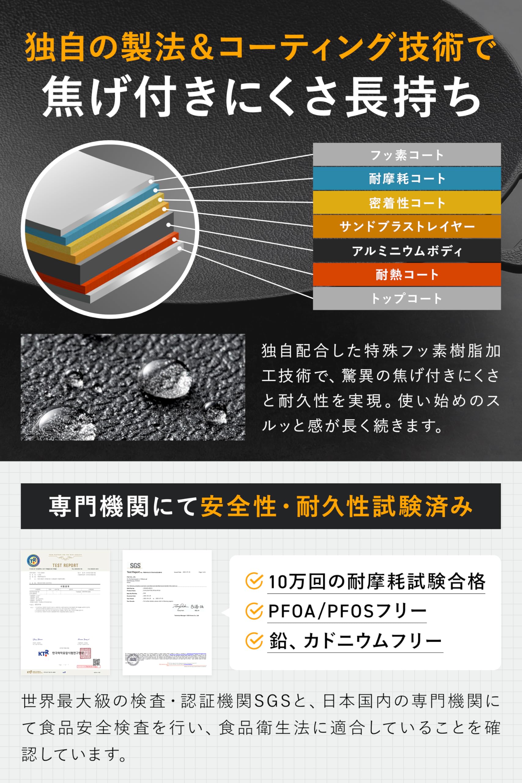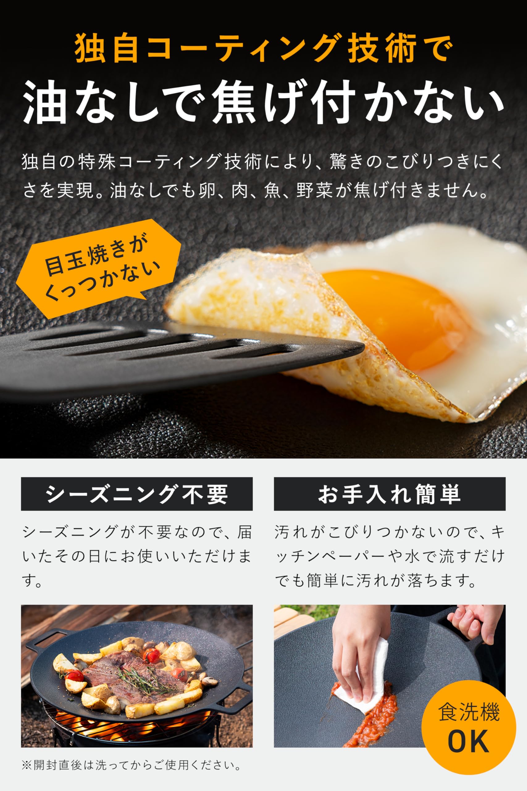 【焦げ付きにくく、お手入れ簡単】独自のフッ素樹脂加工により、油なしでもスルッと調理可能。目玉焼きもこびりつかず、キッチンペーパーでサッと拭くだけ。PFOS・PFOAフリーで安心してお使いいただけます。