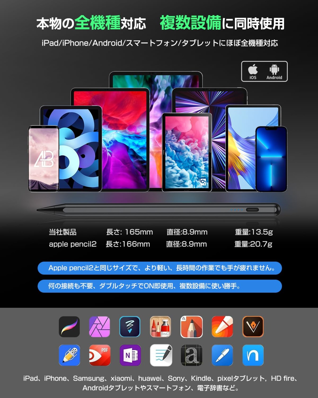 KINGONEタッチペン【全機種対応 超高速充電】 2025業界最高 スタイラスペン 超高精度 1MM極細 アップルペンシル互換ペン 誤ON/OFF防止/電量表示/傾き検知/二重磁気吸着機能対応 iPad用ペンシル 軽量 耐摩 耐久 iPad/iPhone/Android/スマホ/タブレット対応タッチペン